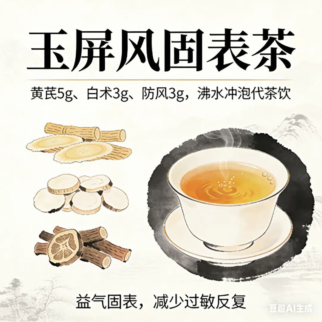 黄芪5g、白术3g、防风3g,沸水冲泡代茶饮,益气固表,减少过敏反复。
