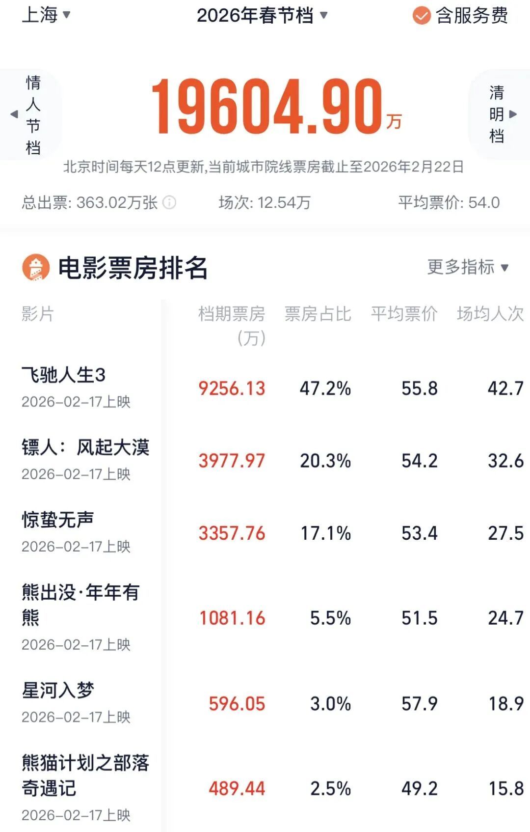 城市票房方面,上海连续5年蝉联春节档城市票房冠军,今年依旧表现强势,核心数据全部稳居全国榜首。截至2月23日22时,上海为春节档贡献票房1.96亿元,观影人次达362万,放映场次超12.5万场,三项数据均位居全国城市第一,营业影院数、银幕数、排片场次均为全国第一。