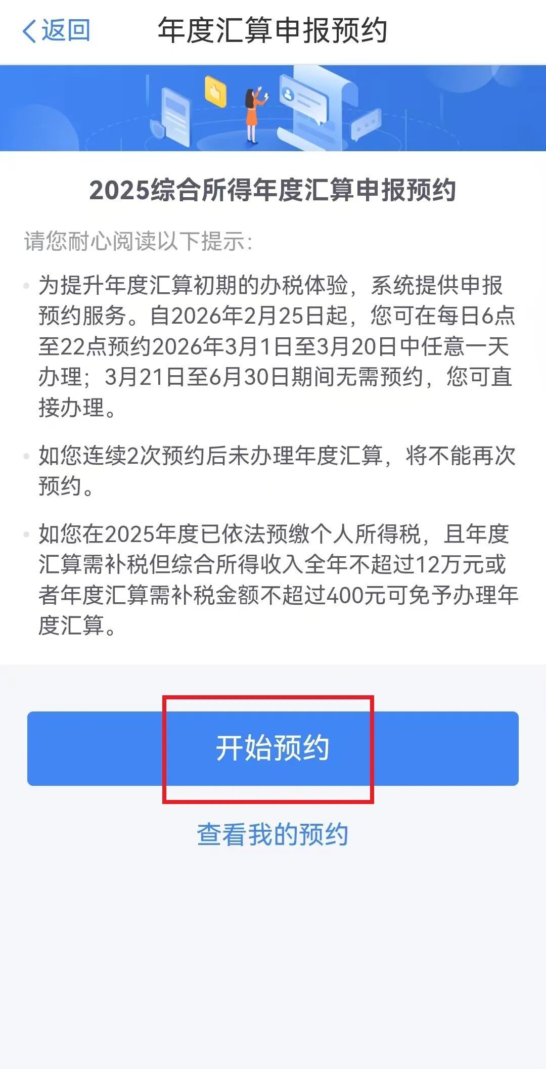 2025年度个税汇算时间为2026年3月1日至6月30日。纳税人如需在汇算初期(3月1日至3月20日)办理年度汇算,自2月25日起,可在每日6点至22点通过个人所得税App提前预约。3月21日至6月30日,纳税人无需预约,可以随时办理。