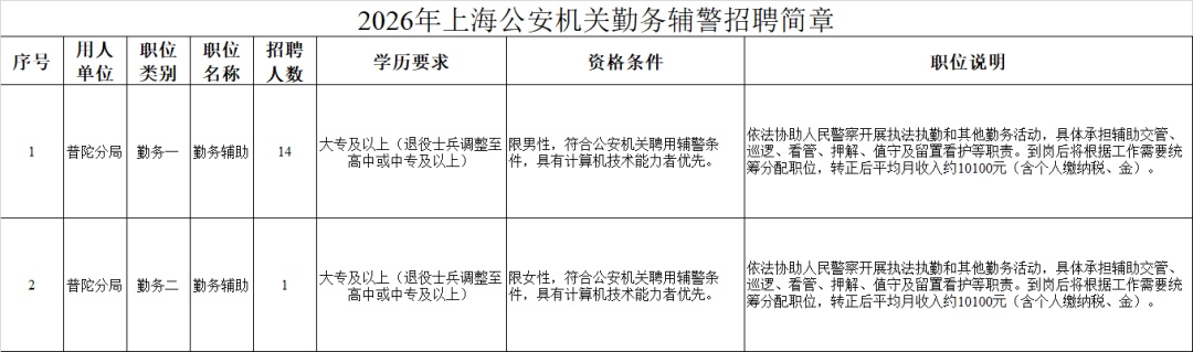 上海市公安局即日起面向社会公开招聘辅警1100名。其中,勤务辅警1005名、文职辅警95名,普陀共招16名。具有上海市常住户口的2026届普通高等院校毕业生和社会人员(不含高校集体户口及各省市驻沪办事处工作集体户口)均可报名(具体条件详见招聘公告)。