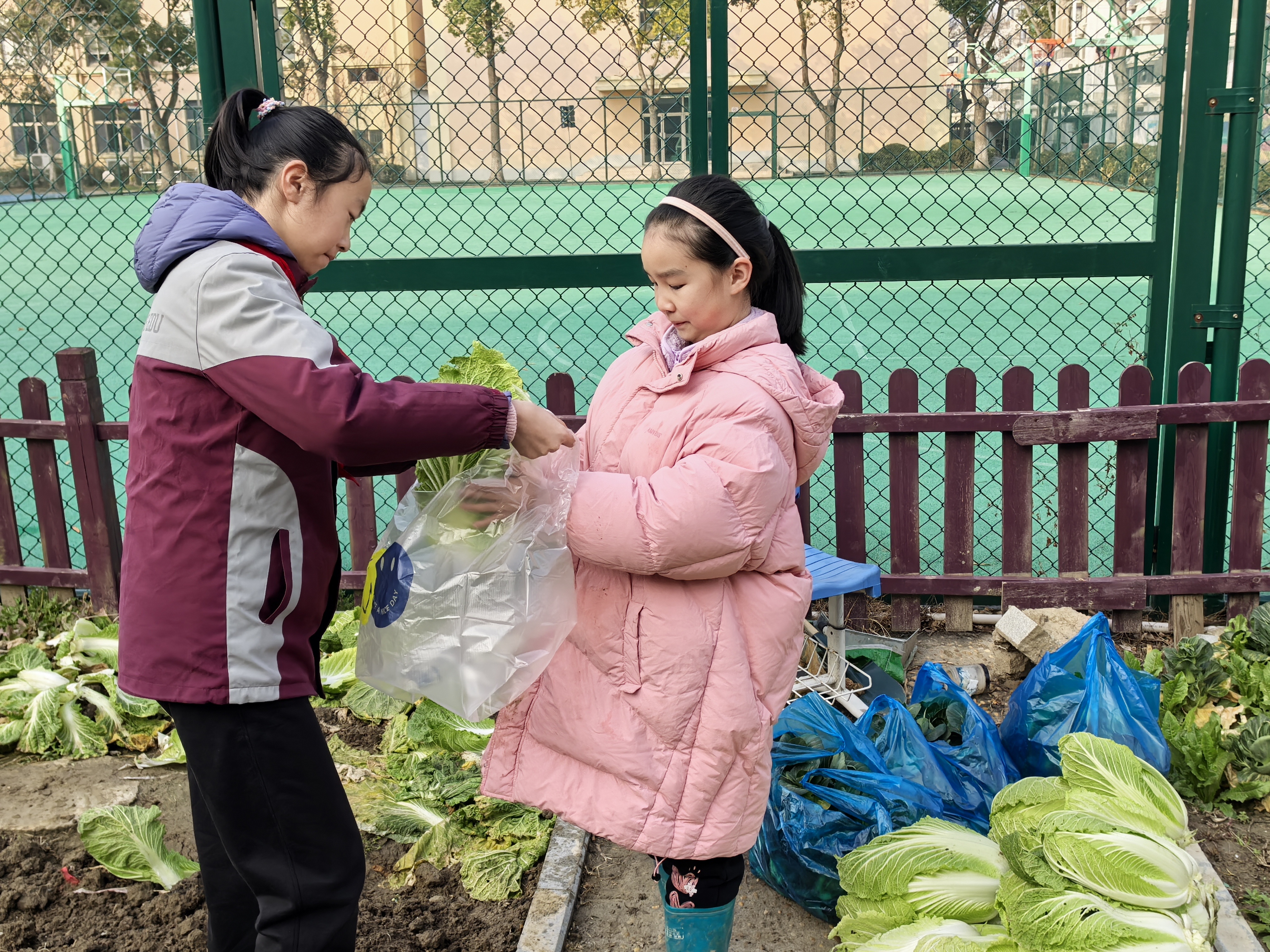 这个名为“仓汇农场”的种植园,面积仅50平方米。农场指导教师范洪回忆,2019年农场开辟之初,学校便同步成立仓汇农场社团,面向五年级学生招募“小农夫”,每期学习一年,让孩子们完整体验四季蔬菜的种植与管理。“冬季蔬菜10月左右播种,虫害少、易管护,寒假主要以采摘为主。”范洪说。