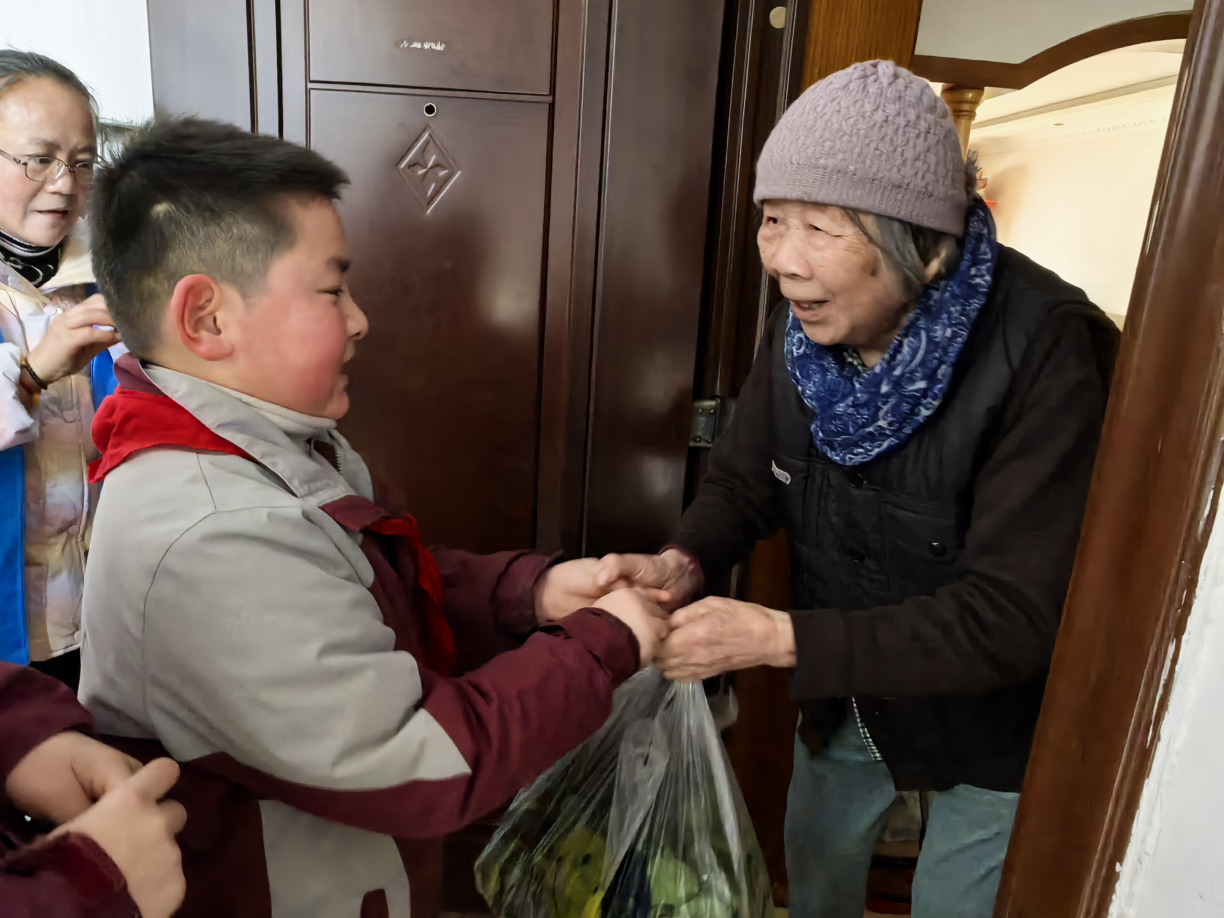 采摘完成后,大家齐心协力将蔬菜送往附近的花园浜社区,为社区老人送上新鲜食材。孩子们有的推车、有的手提,或者两人合力抬送,在社区志愿者协助下,将带着泥土清香的蔬菜送到老人家中,并送上新春祝福。独居的张老伯接过蔬菜开心地说:“真水灵!一会儿我就炒来吃!”老人们连连道谢,现场暖意融融。