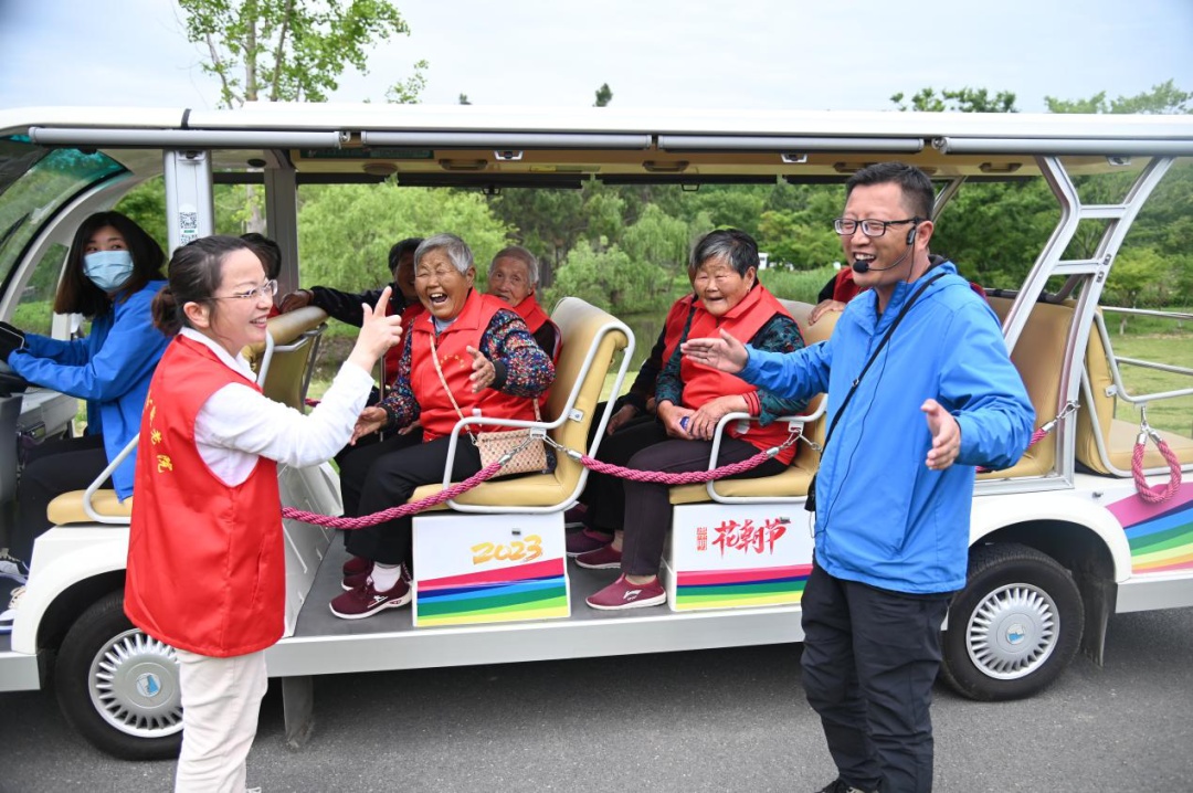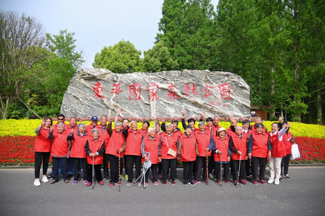 公司导游带老年团游森林公园,逗他们开心