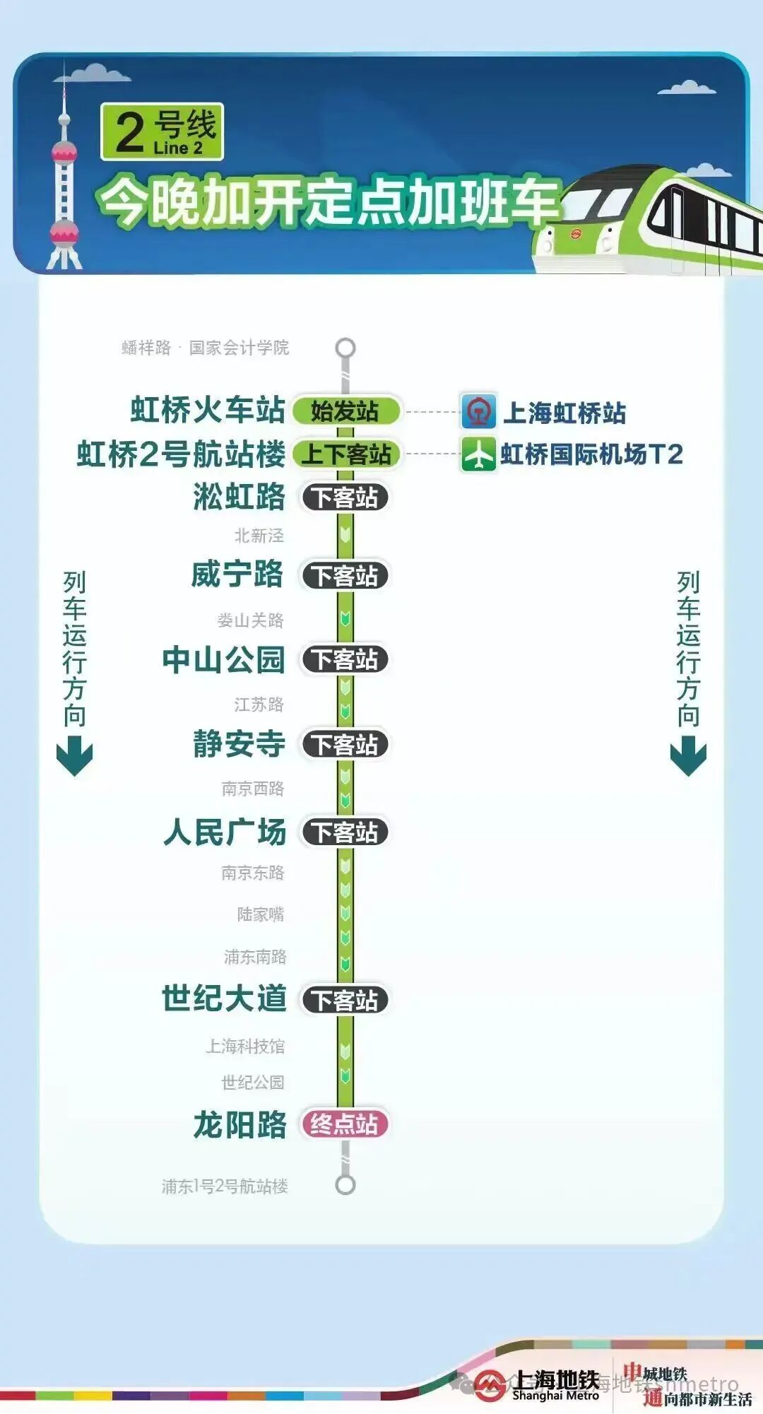 为满足春运期间乘客夜间出行需求,今晚(2月25日),2号线加开定点加班车,虹桥火车站站往龙阳路站加开至次日(2月26日)0时20分;9号线加开定点加班车,上海松江站站往杨高中路站加开至次日(2月26日)0时20分;10号线加开定点加班车,虹桥火车站站往五角场站加开至23时30分;17号线加开定点加班车,虹桥火车站站往西岑站加开至23时30分。定点加班车只停靠指定站点。