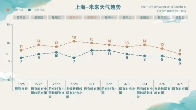 今天(2月25日)天气以阴到多云为主,晨间各区最低气温在6~8℃,全天气温在7~11℃,相对湿度90%~65%,东到东北风3~4级,夜里转东南风3~4级。