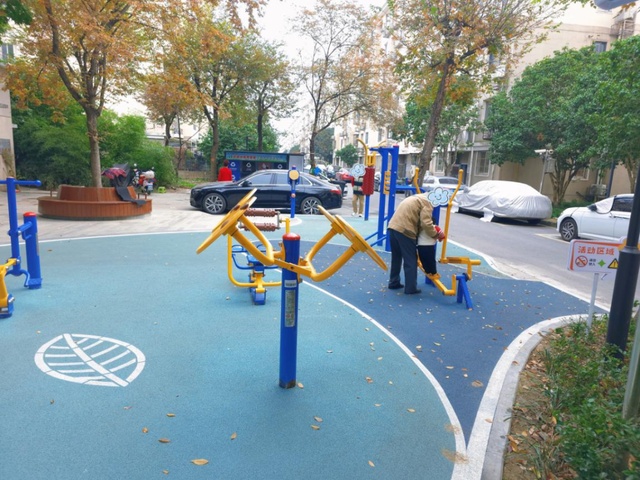 在基础安全和功能完善方面,改造团队对地面进行了分区铺装。健身区和儿童活动区换上了塑胶地垫,缓冲防滑又透水,健身、玩乐更安心。通行区和广场则选用坚固耐磨的花岗岩,确保出行顺畅,也经得起长久使用。原来的休闲广场廊架也变了样——加装了遮阳遮雨的顶棚,成了实用、风雨无阻的“社区共享客厅”,居民们在这里聊天、下棋,空间“活”了,邻里也更亲近了。