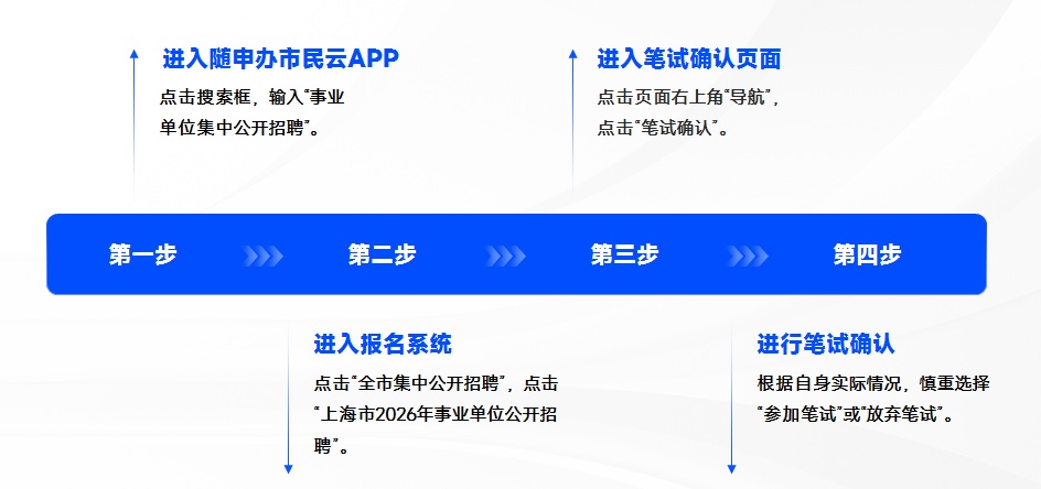 本市2026年事业单位公开招聘笔试确认今天正式开始,为确保顺利参加后续笔试环节,请务必在规定时间内完成笔试确认操作,未在规定时间内完成笔试确认的报考人员视作放弃笔试。