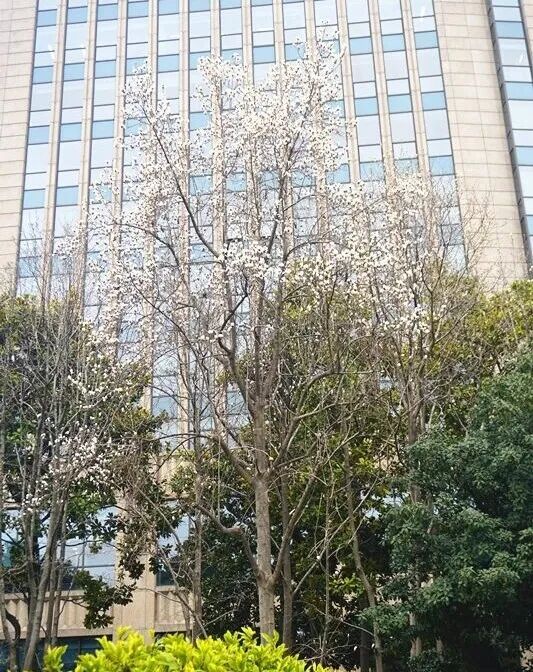 辨识点:树高可达15米,花瓣9片纯白如雪,花蕊金黄,先花后叶,2月底3月初盛放时有凌空欲飞之态。