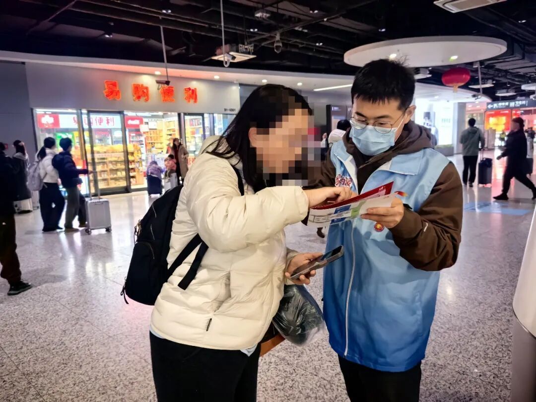 励佳成则是第二次服务。去年他就曾参与虹桥枢纽志愿服务,这份积累的经验,让他面对突发状况时,能沉稳应对。有位50岁左右的男士匆匆跑到服务点,满头大汗、神色焦灼:“同志,帮帮我,刚下火车把白色行李箱拿混了,里面有重要东西,我找了好久都没找到!”党员志愿者励佳成立刻上前安抚:“师傅您别慌,慢慢说,我们帮您一起找。”他细致询问行李箱的外观、内部物品和乘车信息,认真做好记录,随后带着男士前往车站失物招领处,全程协助对接工作人员完成登记。看着男士紧锁的眉头渐渐舒展,励佳成心里也暖暖的。