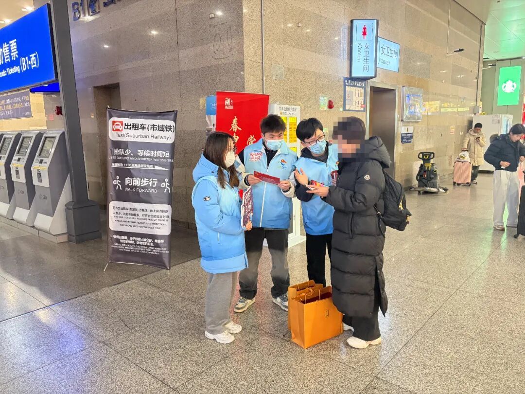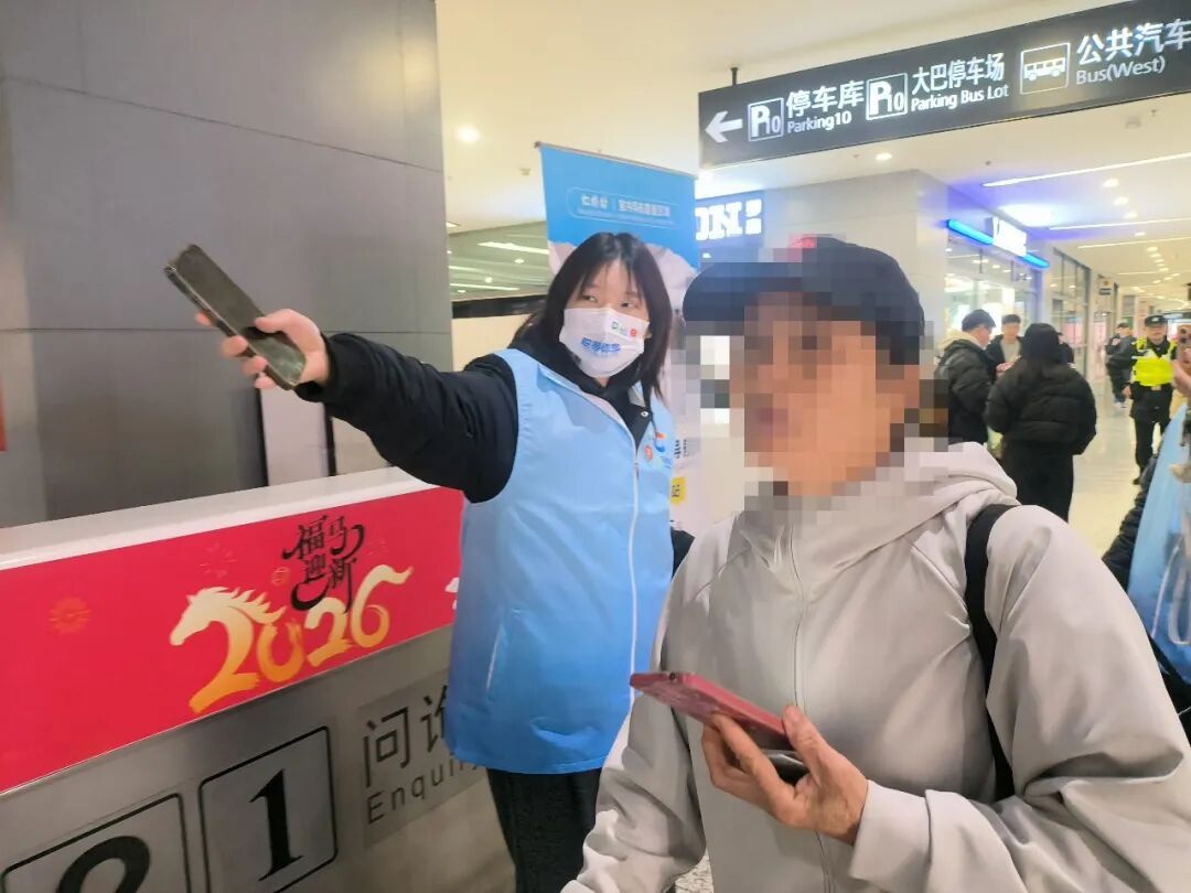喧嚣的车站中,一段无声的相助,更让这份温暖有了别样的力量。一位聋哑旅客独自站在指示牌前,眼神里满是焦急无措。志愿者立刻上前,学着用温和规范的手势耐心沟通,一点点揣摩他的想法,终于弄清他是要找地铁站入口。志愿者们一边用手势回应,一边扶着他的行李,一路贴心陪伴指引路线。当旅客看清地铁入口的标识时,转头露出感激的笑容并用力点头致意,这无声的沟通,搭起了心与心的桥梁,这束微光,照亮了他的路途,也温暖了冬日。