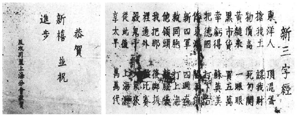 将贺年片作为革命传单使用,在上海新民主主义革命史上并非个案。比如1945年春节前,为冲破黎明前的黑暗,上海党组织采取投寄贺年片的形式,向各界人士宣传时局,这一行动被称为“天亮运动”。“天亮运动”中寄送的贺年片大致分为三种:一种是由学委送给学生、老师们的贺年片,印有“迎接抗日战争最后胜利”等字句,约一千份;另一种是由工委分送给高级职员、工商界人士、地方士绅等人士的贺年片,正面印有“恭贺新禧,并祝进步”八个红字,署名为“反攻同盟上海分会”。这种贺年片背面还印有宣传抗日的《新三字经》:
