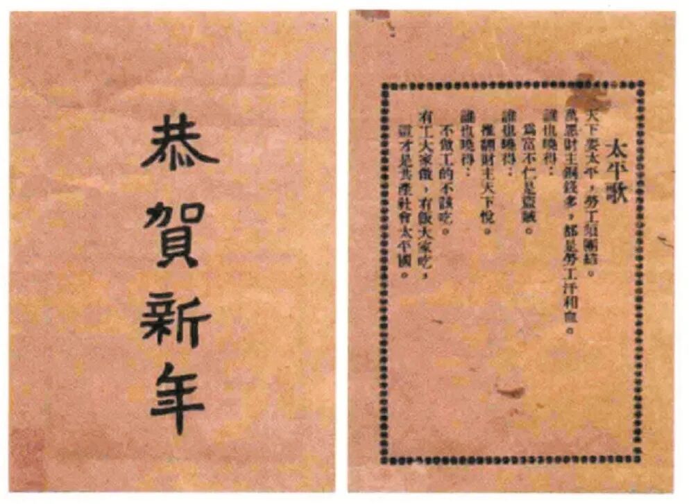 1921年1月28日,农历正月初一上午,在上海闹市区和工人集中区的许多民众都收到了红色贺年片,正面印着“恭贺新年”四个大字,背面花边框中印着一首宣传共产主义的《太平歌》: