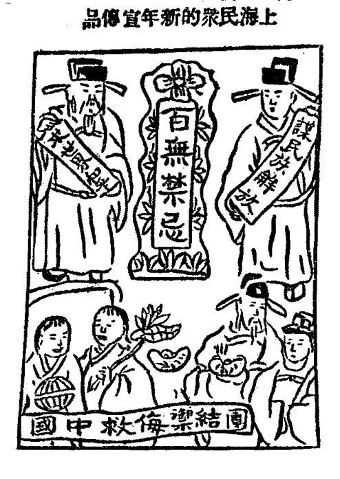 1938年3月《新华日报》第4版发表了署名沈奇的文章《上海的救亡运动》(该文也在《战地通信》1938年第21期刊载),其中记述:1938年春节期间,许多人家都收到了“与旧式人家过年常黏贴的印着财神菩萨和百无禁忌的红字条相仿”的红纸条。文章以插图的形式保存了这张纸符的图文内容。纸符分上下两部分:上半部分居中印着“百无禁忌”四字,两旁分列着两位头戴直脚幞头的神仙,神仙手持“谋民族解放”“求世界和平”的条幅;下半部分居中印着一个大元宝,两旁分列着四位神仙,右边两位分别手持笏板和元宝,大约属财神。左边两位分别手持荷花与盒子,应该是和合二仙。四位神仙身前的横幅上印着“团结御侮救中国”。