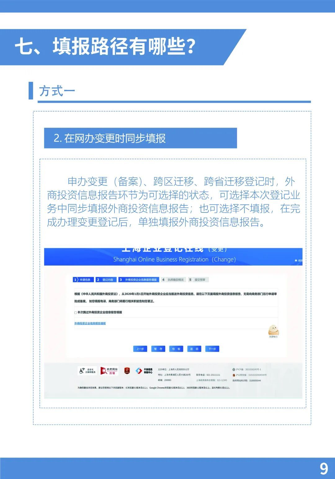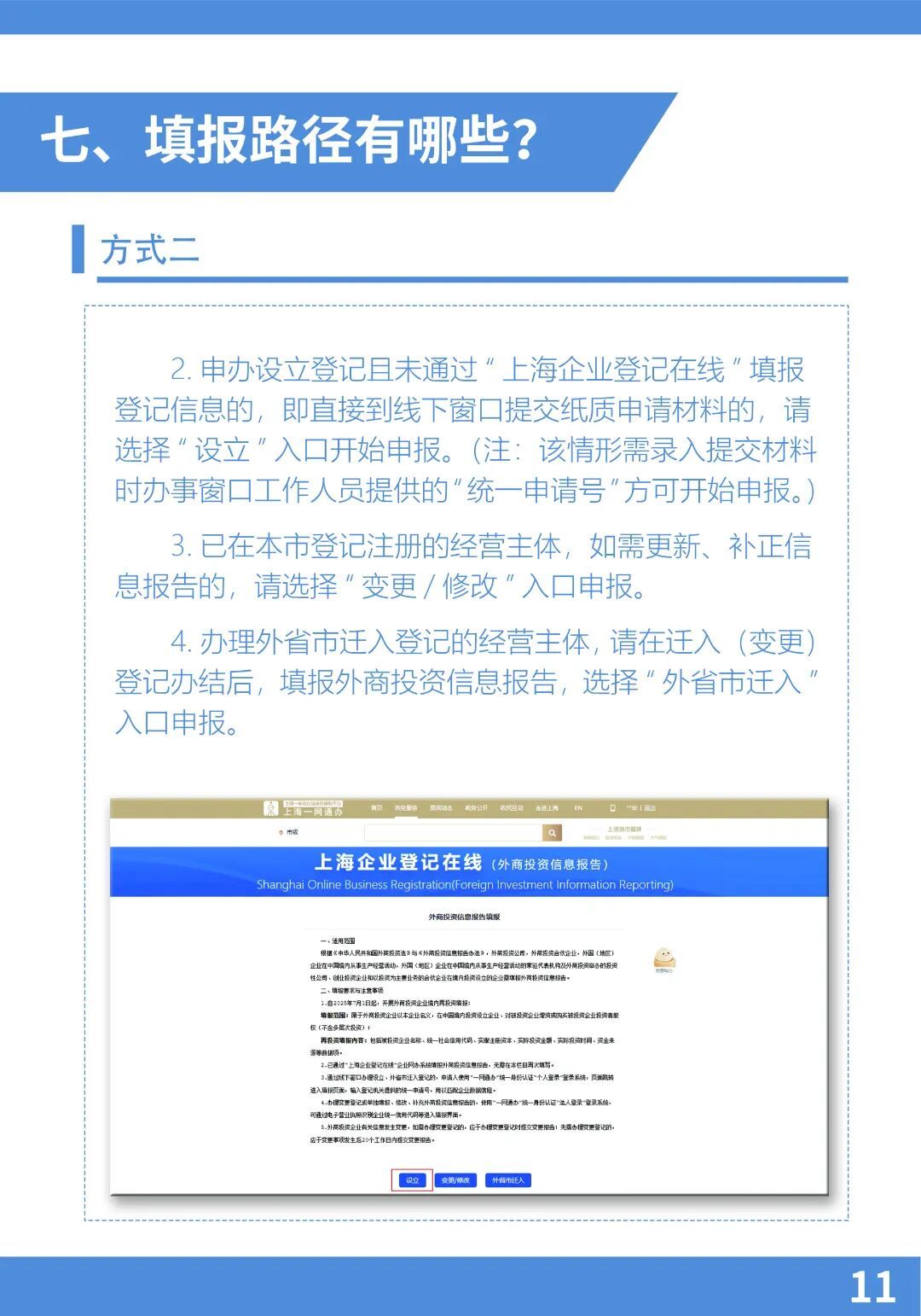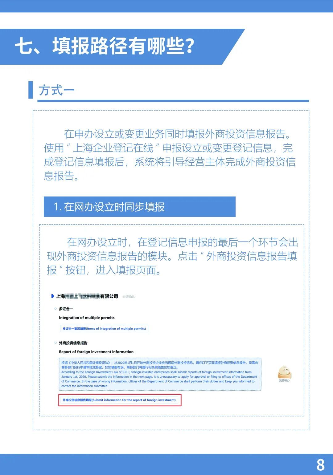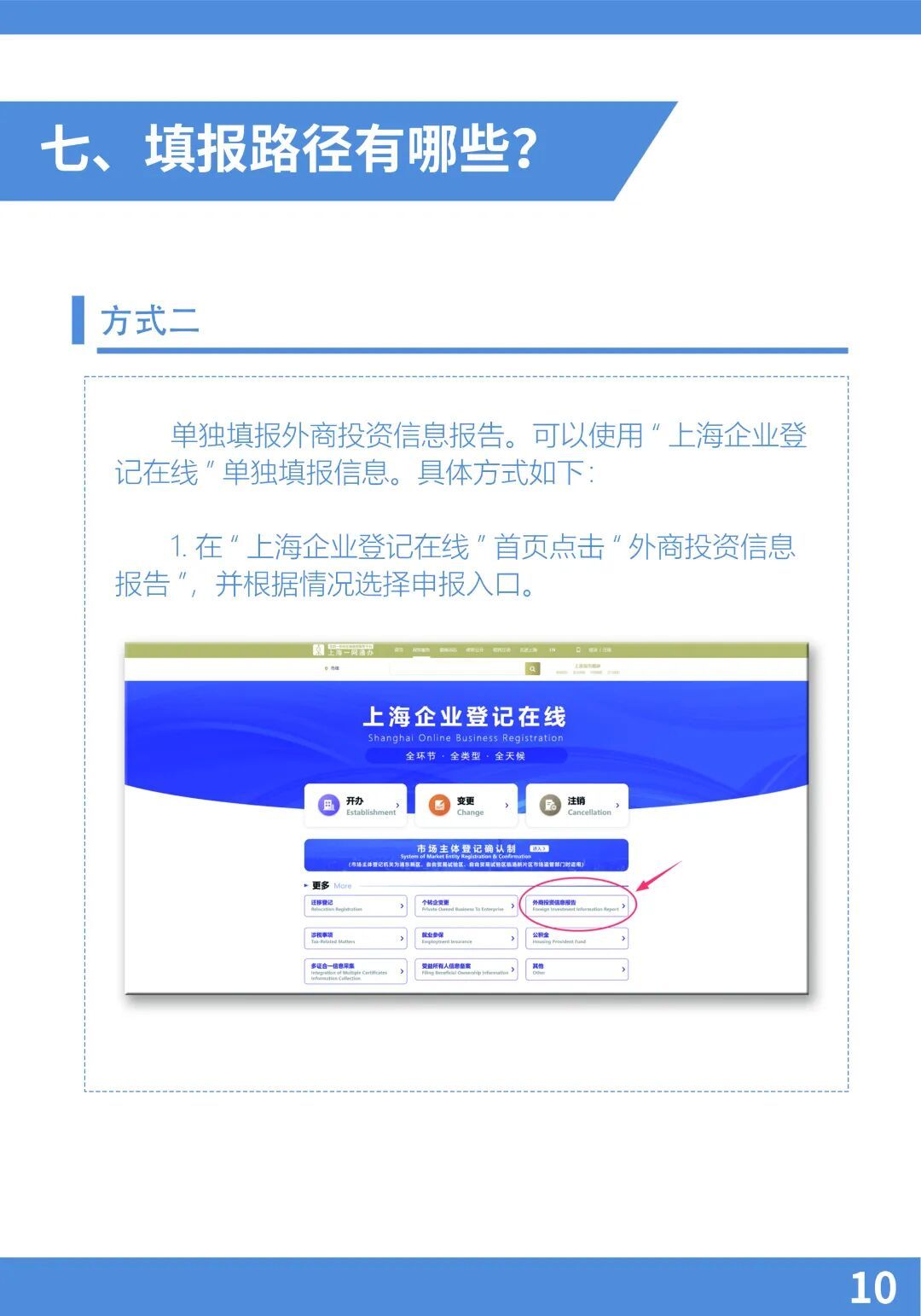 三、填报路径:登记注册地位于上海市的外商投资企业通过“上海企业登记在线(外商投资信息报告)”(点击文末左下角“阅读原文”,进行线上填报)提交初始、变更报告(外商投资企业境内投资基本情况表),向商务主管部门报送投资信息。