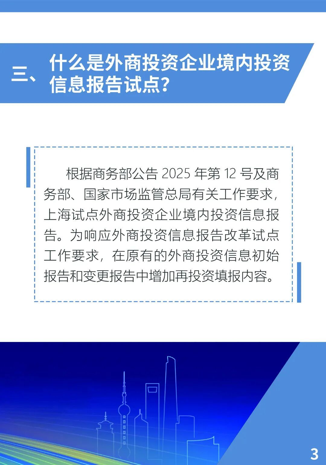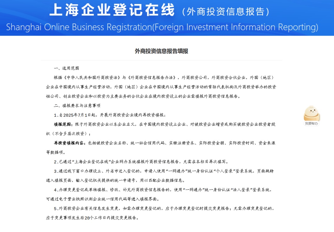 根据商务部公告2025年第12号(《外商投资企业境内投资信息报告试点》),自2025年7月1日起,上海作为首批试点地区,开展外商投资企业境内投资信息报告试点工作。现就有关事项提示如下: