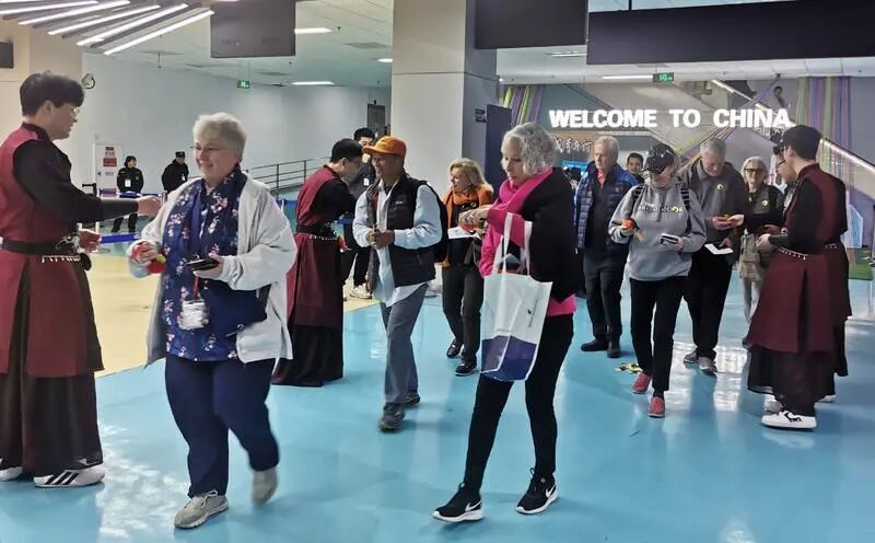 在T1入境通道,身着华丽汉服与唐装的工作人员早已列队等候。衣袂飘飘,笑意盈盈,工作人员用最具东方韵味的方式,向来自全球各地的游客致以最诚挚的问候。