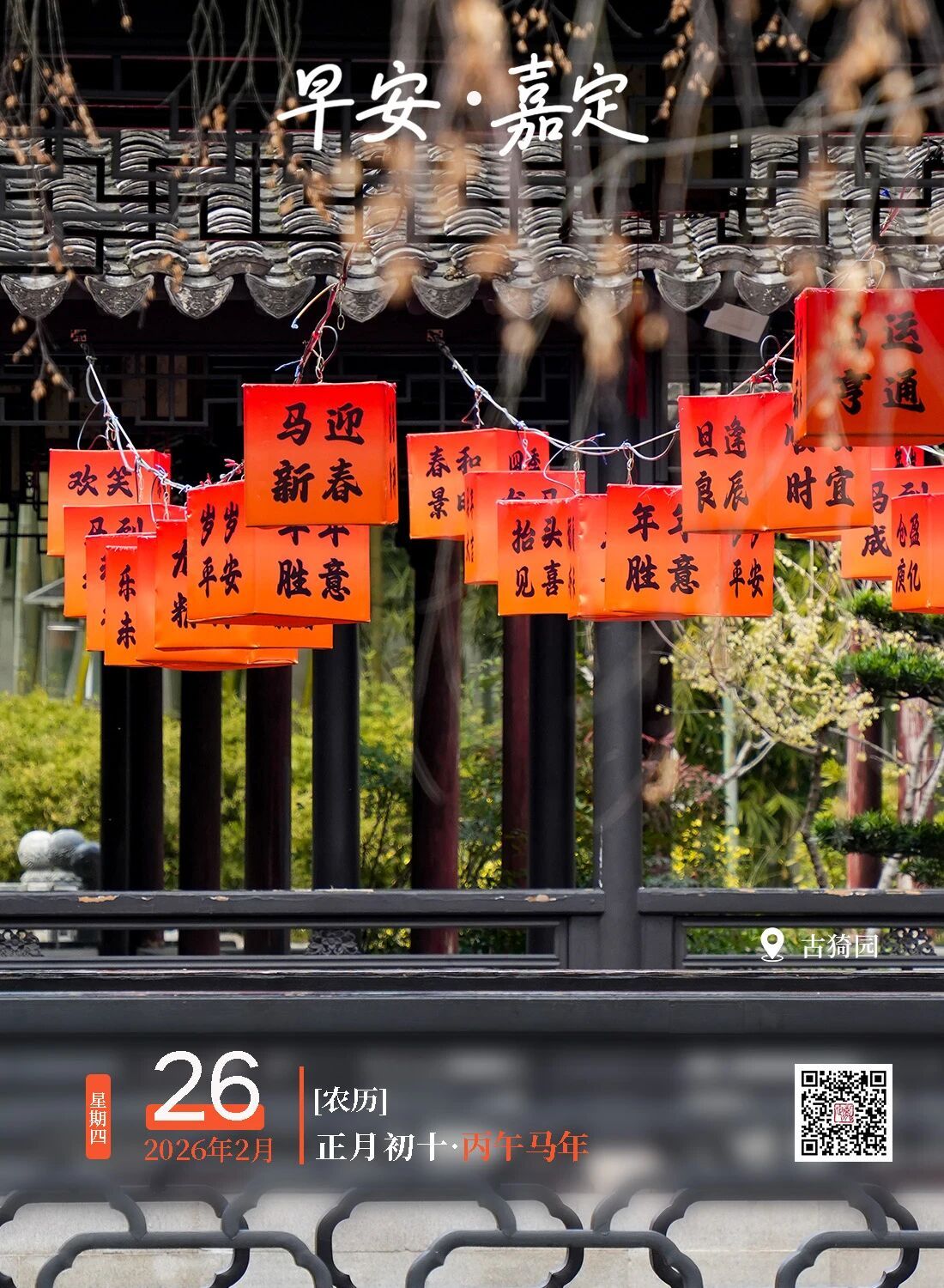 春风拂过古猗园的飞檐,红灯摇曳,将美好祈愿轻轻摇晃。新绿的草木在檐下舒展,唤醒了一园生机。早安,嘉定!愿这春日的暖意与灯笼的吉光,伴你步履生风,新的一天,抬头见喜,万事胜意。