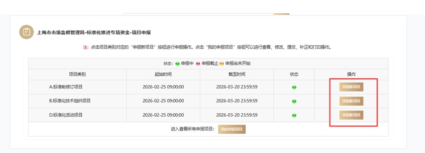 3.搜索框输入“上海市标准化推进专项资金”后立即搜索,选择通知中需要申报的对应项目类别,点击“立即申报”,进行在线填报。