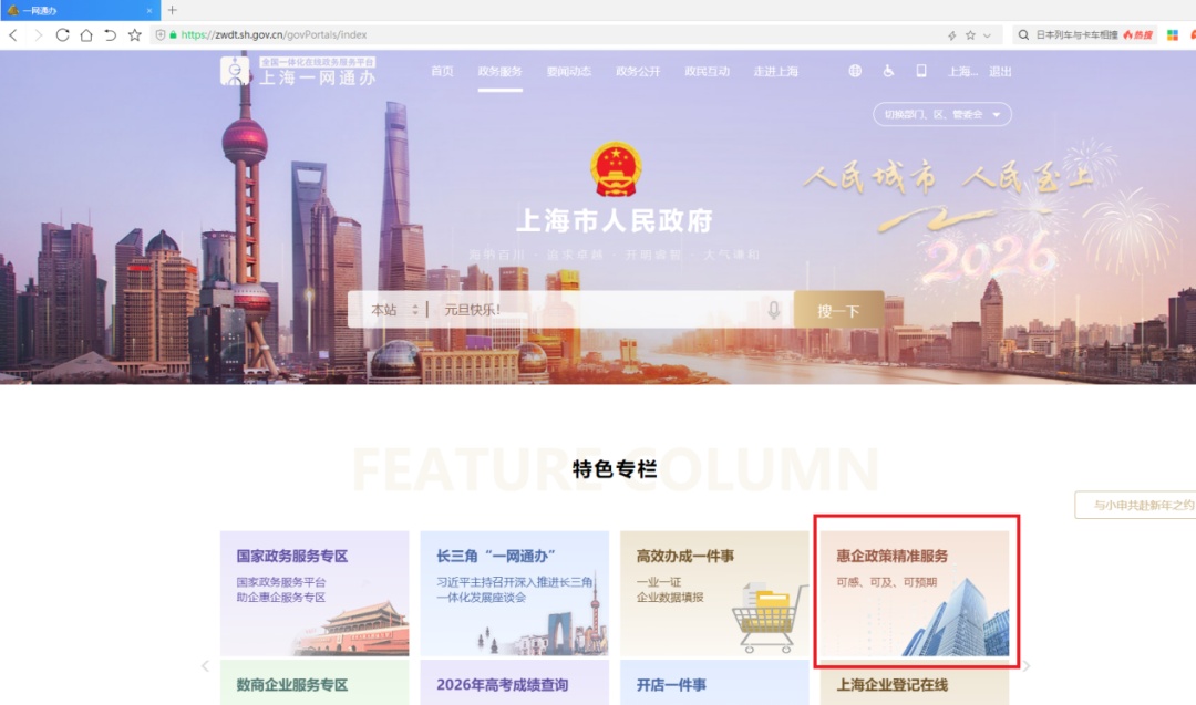 2.进入“政务服务—特色专栏”,选择“惠企政策精准服务”(https://zwdt.sh.gov.cn/qykj/shell_oc_policy_zq/policy/index?from=zwfw)。