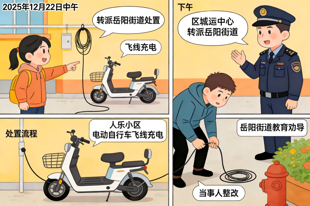 区城运中心立即转派岳阳街道处置,当天14:00工作人员到场教育劝导,当事人当场整改收回电线,从上报到排险仅约2小时。
