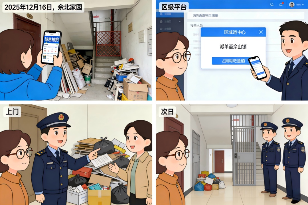 上报信息由区城运平台精准分派至对应街镇,各应急处置部门快速响应、现场核查、及时处置。对复杂、反复出现的隐患,平台将启动多部门联合会商、联合执法机制,形成治理合力,确保隐患早发现、早处置、早清零。