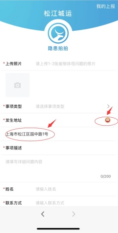 3.在“发生地址”中可点击地图定位自动填写地址,也可在地址栏中手动输入安全隐患发生的地址;