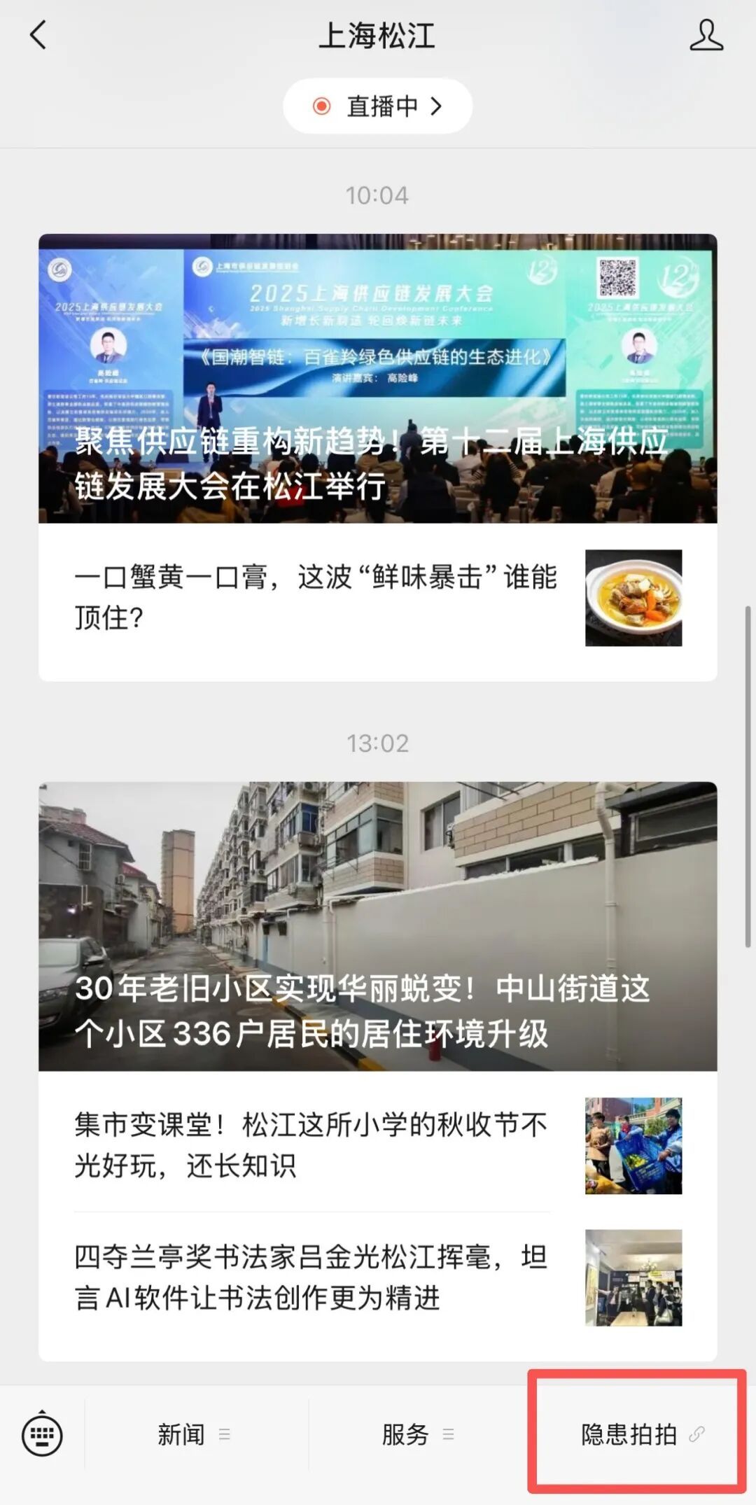 市民可以通过“上海松江”App、微信公众号,以及“松江城运中心”微信公众号使用“隐患拍拍”功能,当你发现身边存在安全隐患时,可以拍照上报问题,有关部门将及时审核处理。