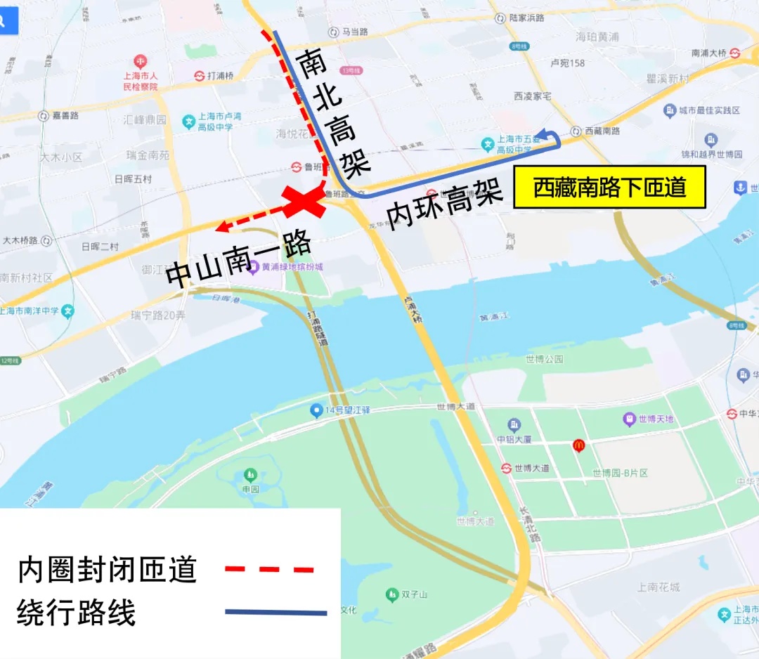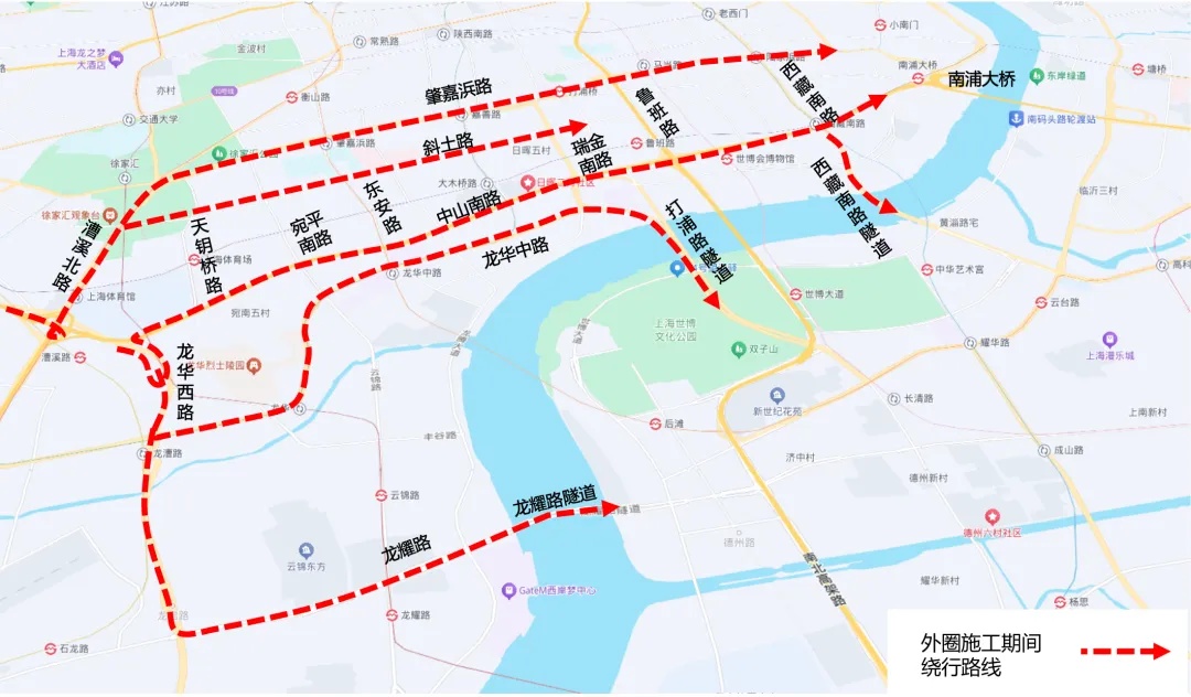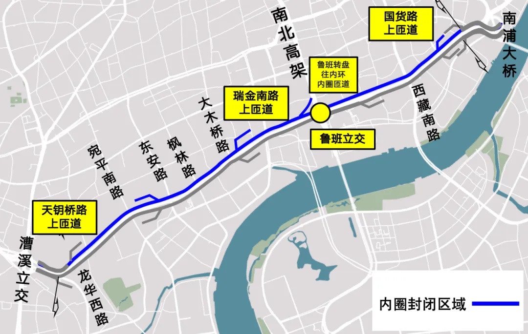内环高架设施提升及功能完善工程四期(龙华西路至南浦大桥)第三、四阶段施工启动,相关交通组织调整: 01 施工准备工作 4月7日夜间24时至次日晨6时内环高架(龙华西路至南浦大桥)主线双向封闭,鲁班转盘往内环内圈匝道封闭。 02 桥面系铺装和伸缩缝施工 4月8日至5月5日周一至周四夜间24时至次日晨6时内环高架(南浦大桥至龙华西路)外圈主线封闭;周五、六、日夜间24时至次日晨6时内环高架(南浦大桥至龙华西路)双向主线封闭,鲁班转盘往内环内圈匝道封闭。 5月6日至5月31日周一至周日夜间24时至次日晨6时内环高架(南浦大桥至龙华西路)内圈主线封闭,鲁班转盘往内环内圈匝道封闭。 鲁班转盘往内环高架内圈匝道封闭期间,原途经车辆需往外圈西藏南路下匝道驶离高架,掉头后沿中山南一路继续行驶,或提前经南北高架西侧徐家汇路、打浦路隧道等周边道路绕行。 公安交管部门提醒广大市民:夜间内环高架主线封闭期间,将对投影面下中山南路带来一定的通行压力,途经驾驶人可选择沿陆家浜路、徐家汇路、肇嘉浜路、国货路、斜土东路等平行道路或远端快速路网绕行。出行前,请合理规划路线,避开拥堵路段。经过施工区域时注意安全,减速慢行,务必按照标志标线和民警指挥有序通行。