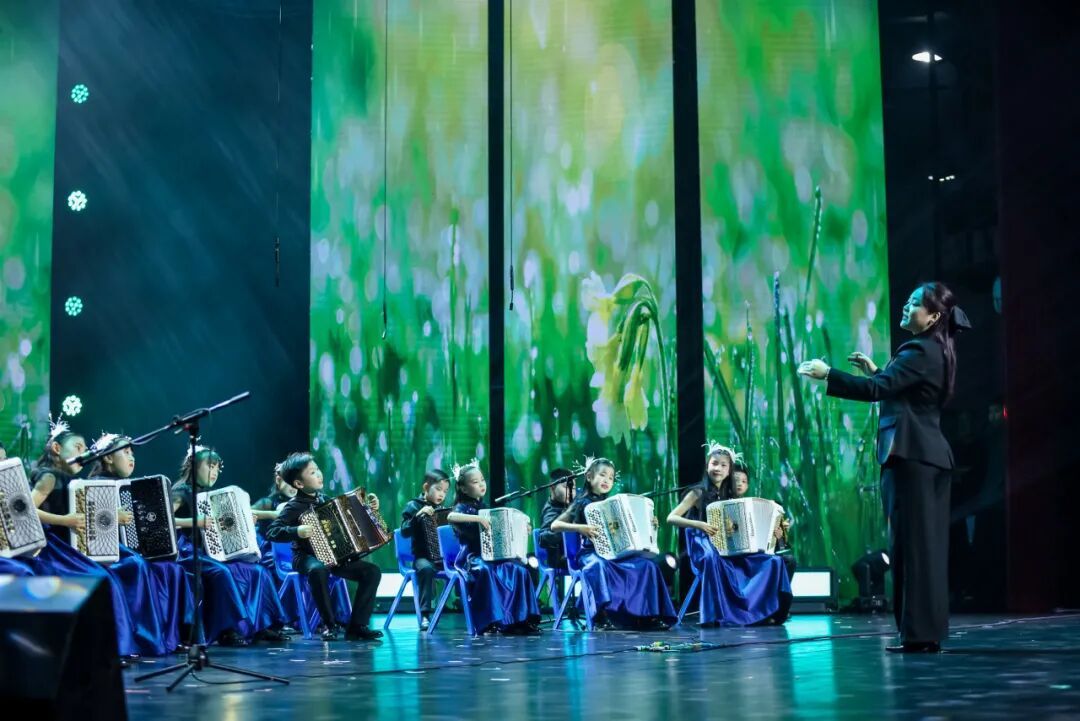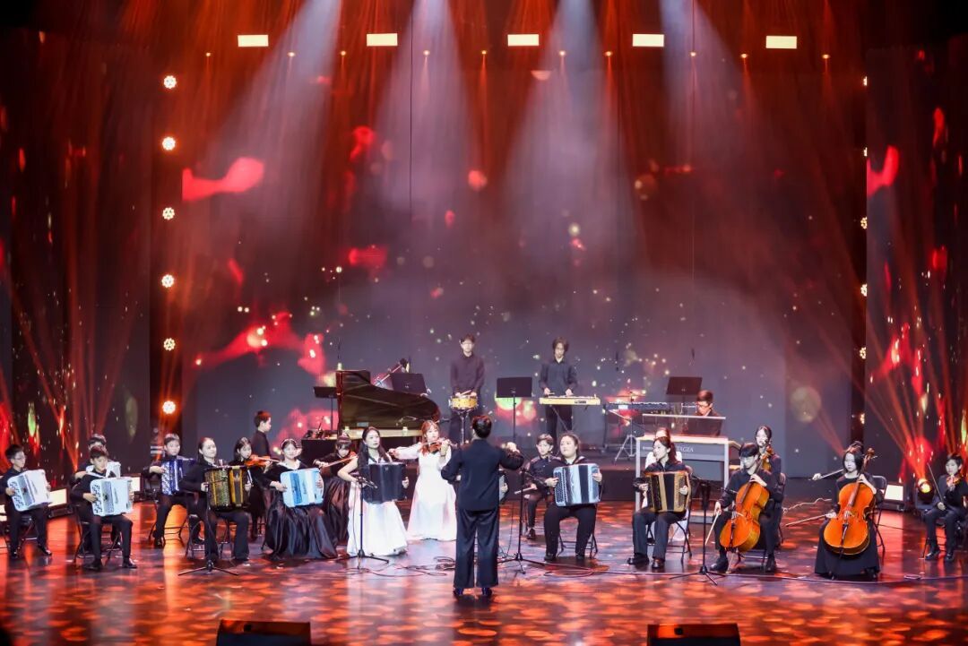 当晚的舞台,是手风琴艺术多元魅力的全面绽放,11个精彩节目轮番登场,曲风涵盖经典民歌、世界名曲、原创佳作,演绎形式融合重奏、合奏、室内乐及“手风琴+”跨界融合,让观众沉浸式感受手风琴的无限表现力。上海市浦东新区青少年活动中心键盘乐团的《逐峰少年》,以少年朝气奏响青春乐章;上海市盲童学校萤火虫手风琴乐团的唐承宇、朱玥颖,凭借不到两年的学习经历演绎《扬帆远航》,用清澈音符诠释对音乐的执着热爱,让艺术的温暖直抵人心;上海市闵行区实验小学向日葵手风琴乐团以多声部重奏重新演绎经典童谣《小燕子》,唤起全场观众的童年回忆;上海市静安区青少年活动交流中心星韵手风琴乐团演绎的《阳光》,用丰富的层次与灵动的色彩,勾勒出独有的音乐意境。
