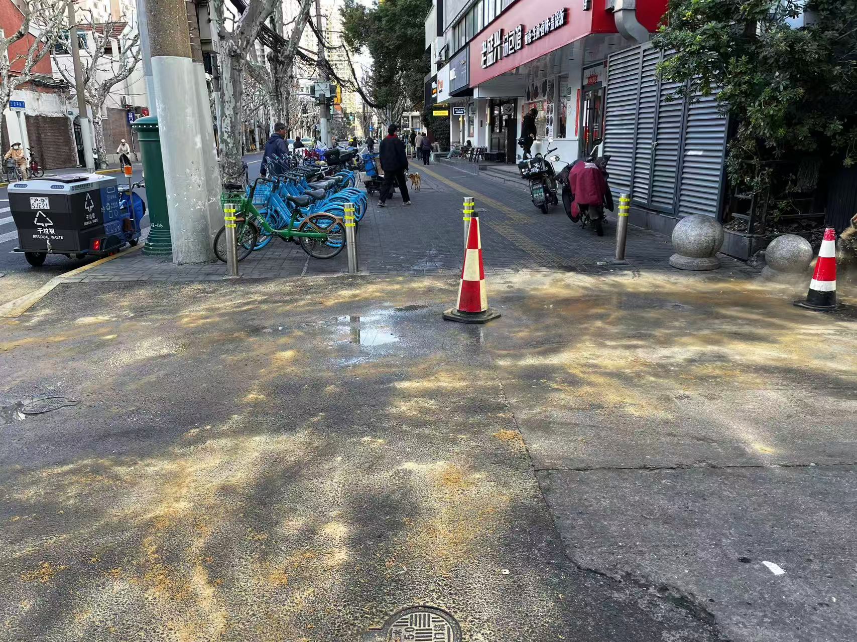 为防止行人滑倒受伤,城运中心立即联系市容清道班,对污染路面开展高压水枪冲洗,及时铺撒黄沙、设置警示牌,第一时间筑牢安全防线。