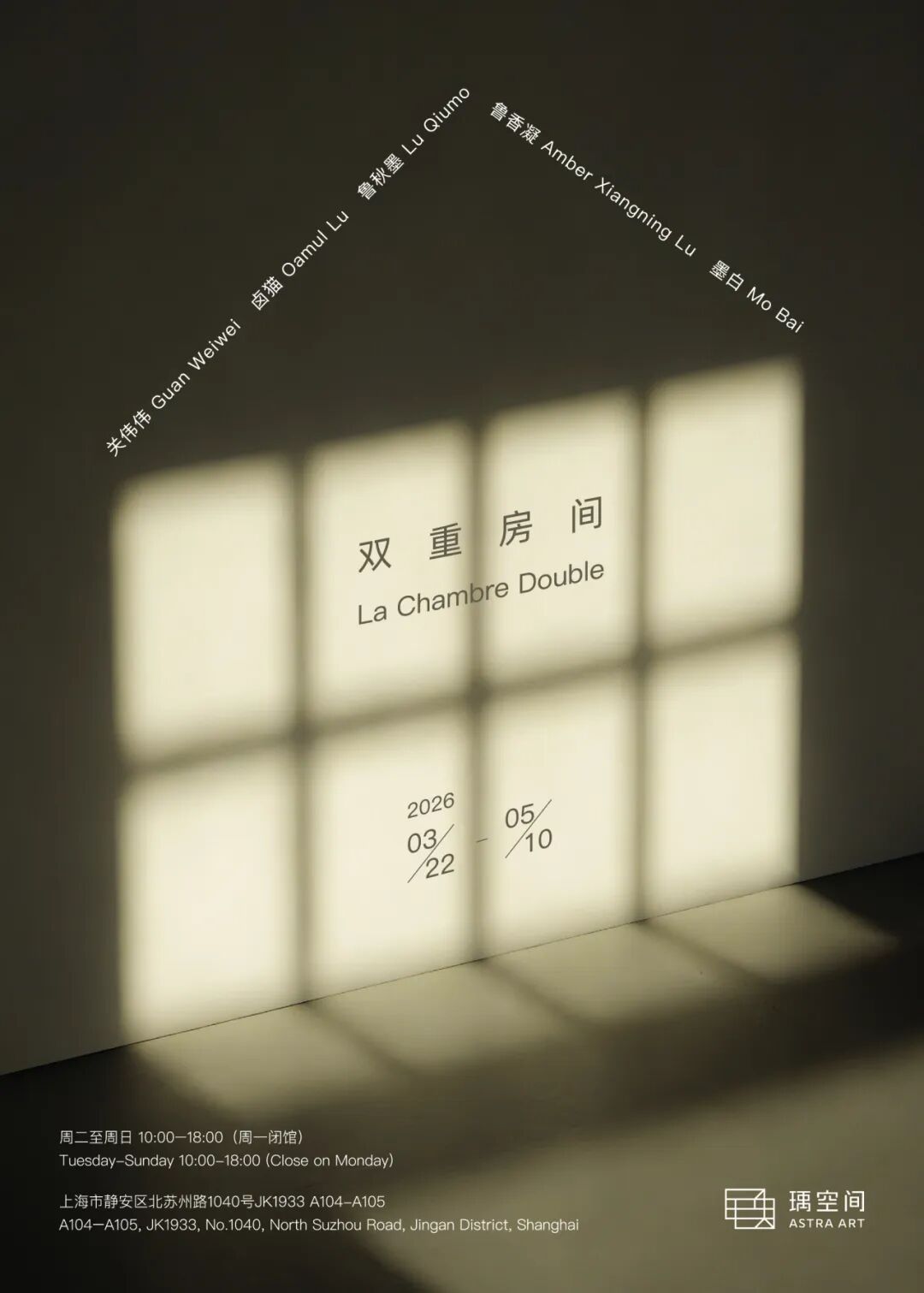 本次群展将集中呈现艺术家关伟伟、卤猫、鲁秋墨、鲁香凝与墨白的近期创作。以丰富的叙事和多元的媒介,邀请观者步入一场关于日常空间的深度探索。