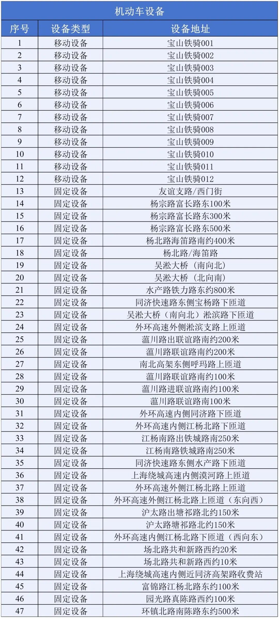 为进一步加强道路交通管理,规范通行秩序,保障市民出行安全,宝山区近期新增47套非现场执法设备,现将具体设置点位信息公布如下: