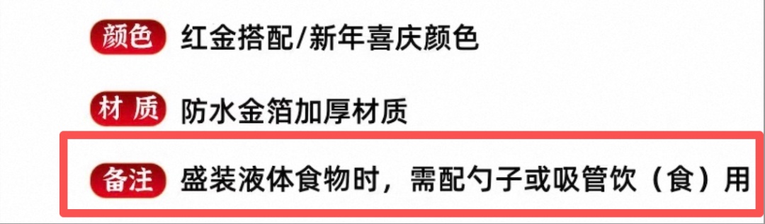 今年2月,新华社记者走访多处农村酒席发现,现场普遍使用通体红墨印刷的一次性纸杯。宴席主曾先生称,其以48.8元网购500个印有“囍”字的加厚金箔纸杯,正是看中其喜庆外观,而商家页面宣称该款为食品级、可待客喝水的纸杯,外包装却标注“需配合吸管使用”,宣传与实物标注相悖。