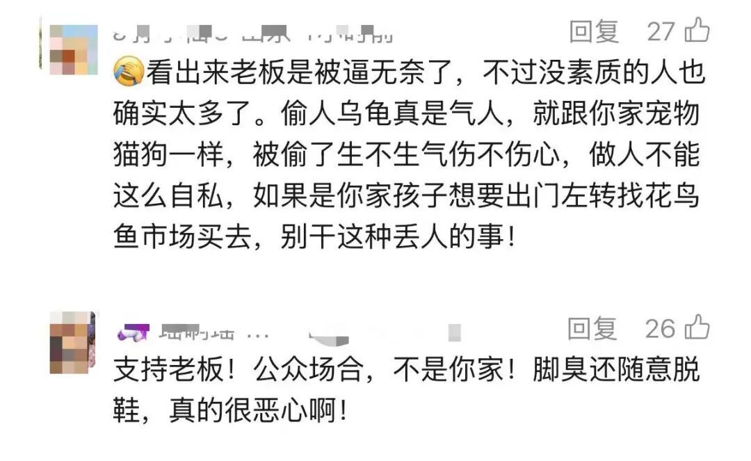 店老板刘先生称,此举实属无奈之举。“我们在好好用心经营店铺,但有些客人又在屋里抽烟、打牌、脱鞋,还把脚搭在凳子上,这样让别人怎么坐呢?”刘先生无奈地表示,店内的鱼池本来养了70多只小乌龟,一半都被偷走了,还有客人把茶水、瓜子皮等扔进鱼池,对餐厅环境造成了很大影响。