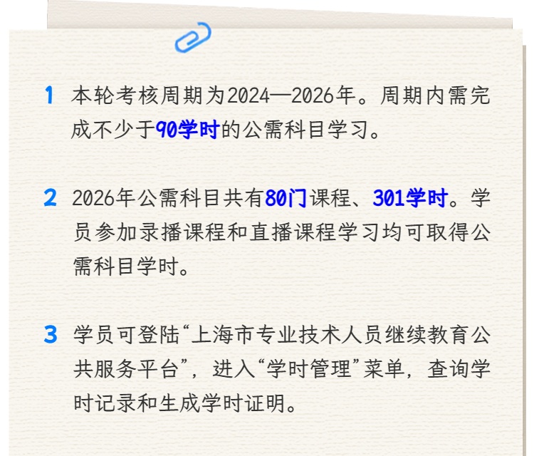 据市人社局介绍,2026年上海市专业技术人员继续教育公需科目学习已正式启动!2024-2026一个周期,完成规定的公需科目培训是聘任专业技术职务或者申报评定上一级资格的重要条件。学习要求详见↓