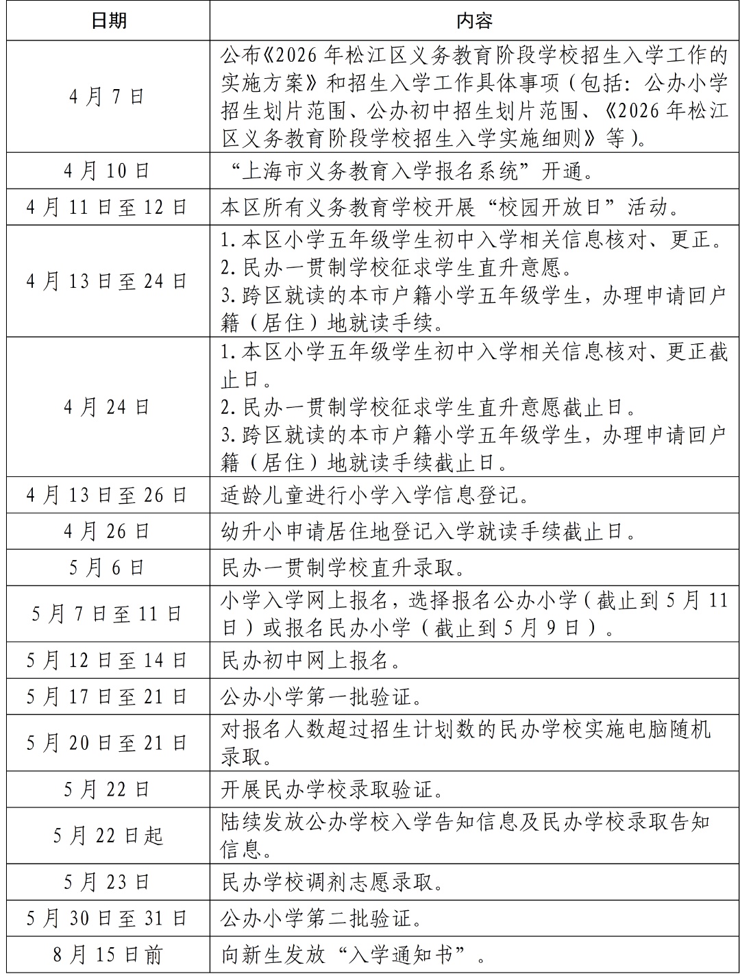 根据国家和上海市义务教育相关法律法规和政策文件精神,为依法保障适龄儿童少年平等接受义务教育权利,促进依法办学、规范义务教育阶段学校招生入学工作,现就2026年松江区义务教育阶段学校招生入学工作制定以下实施方案: