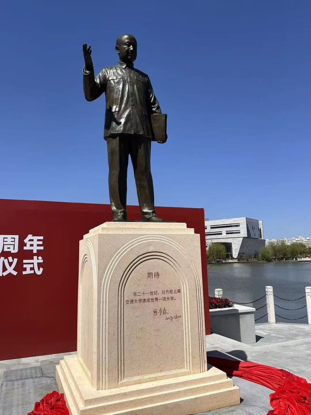 雕塑身姿挺拔,目光深邃,望向远方,仿佛正穿越时光,凝望着他深爱的母校与后辈。基座上,镌刻着钱学森留给母校的殷殷寄语:“在二十一世纪,努力把上海交通大学建成世界一流大学”。
