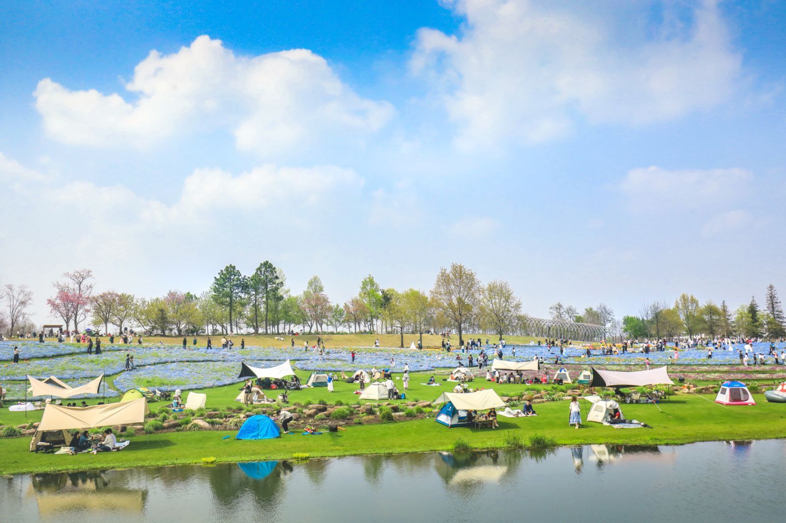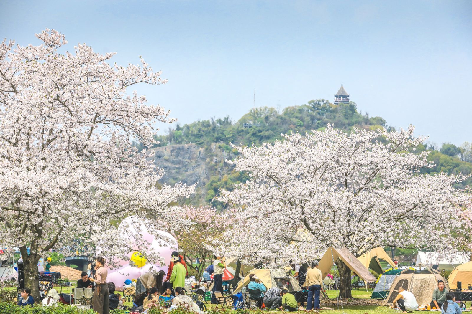 游客在樱花树下露营