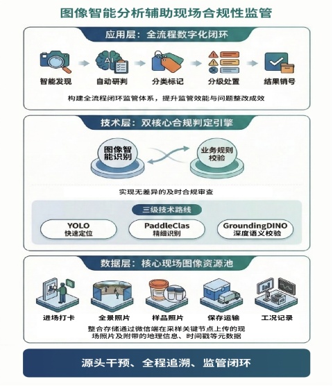 针对进场打卡、全景照片、样品照片、保存运输、工况记录等5大类核心现场图像,打造“图像智能识别+业务规则校验”双核心合规判定引擎。采用快速目标定位、精细识别、深度语义校验的三级递进技术路线,结合预设业务规则,实现月均20万余张照片的秒级判读,对采样人员数量、样品保存条件、现场操作规范性等核心合规要素进行无差异的即时合规审查。基于输出的判定结果,实现异常问题从识别到整改的全链路管控,打通监管业务衔接断点。