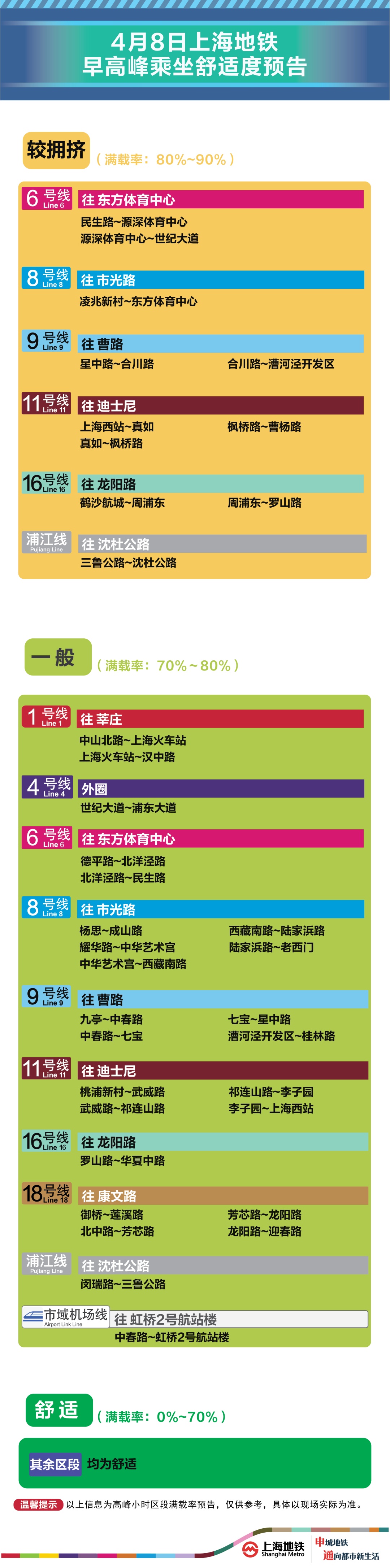 为提升上海地铁早高峰期间出行服务水平,提升乘客乘坐体验,上海地铁向乘客提供乘坐舒适度预告,方便乘客提