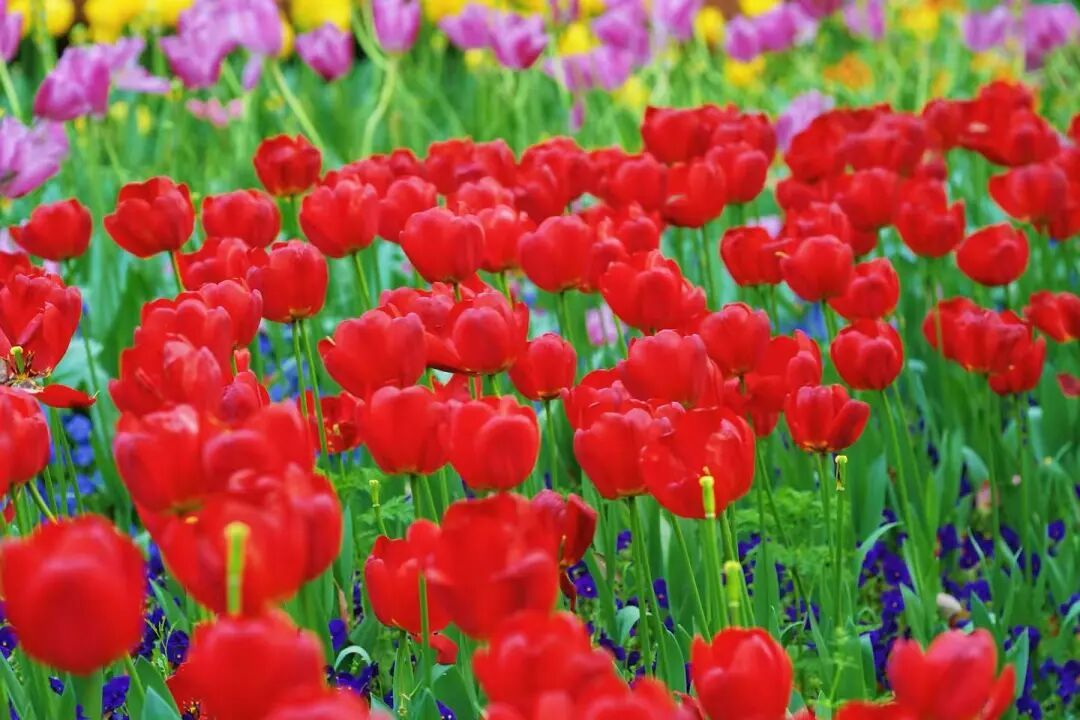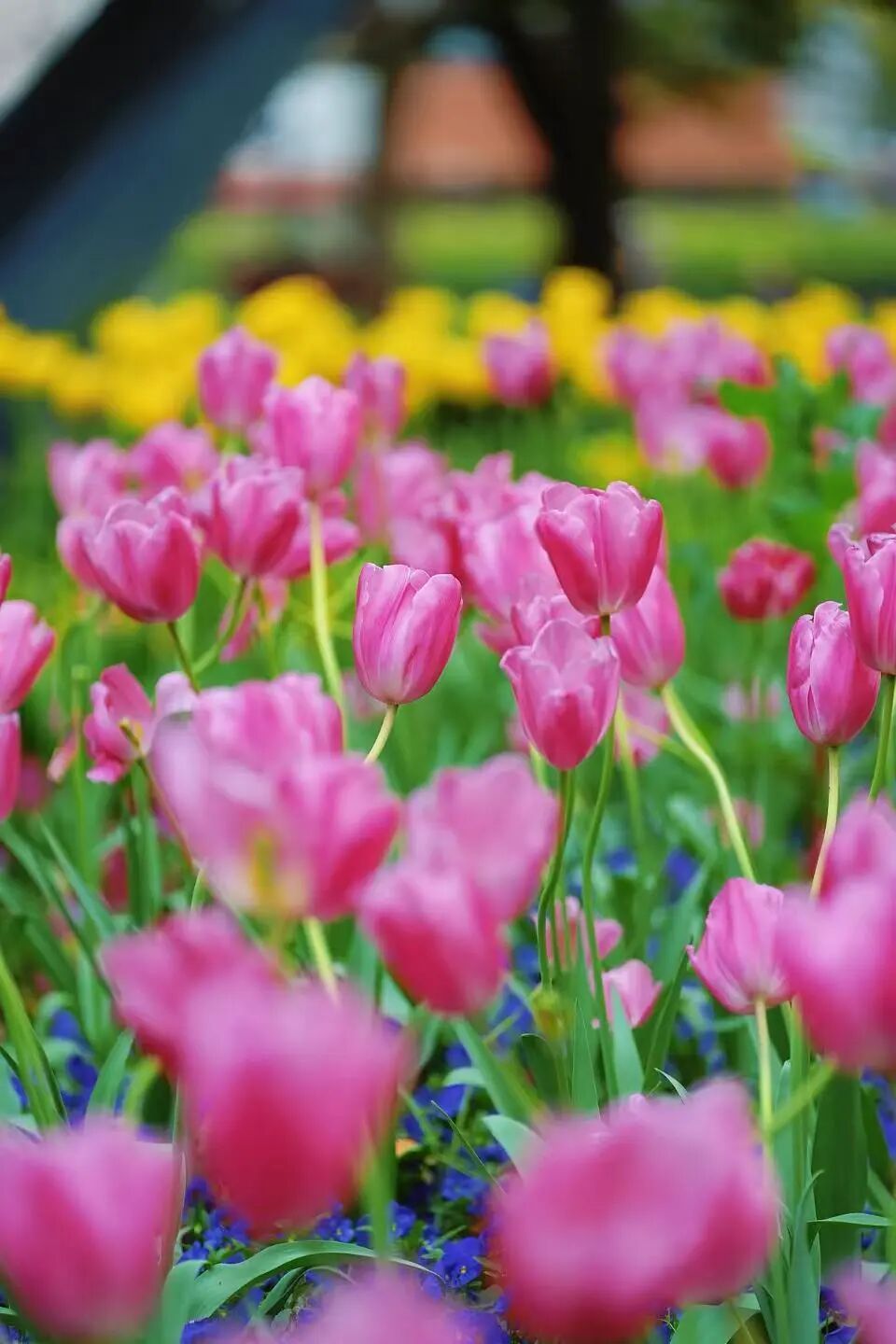 走进园内,春日景致尽收眼底,成片的郁金香满屏盛放,红、黄、粉三色交织成彩带,错落有致。樱花树满枝繁花,粉白花瓣随风轻摇,偶有花瓣飘落。湖面倒映着花影树姿,沿步道走一圈,处处是景。