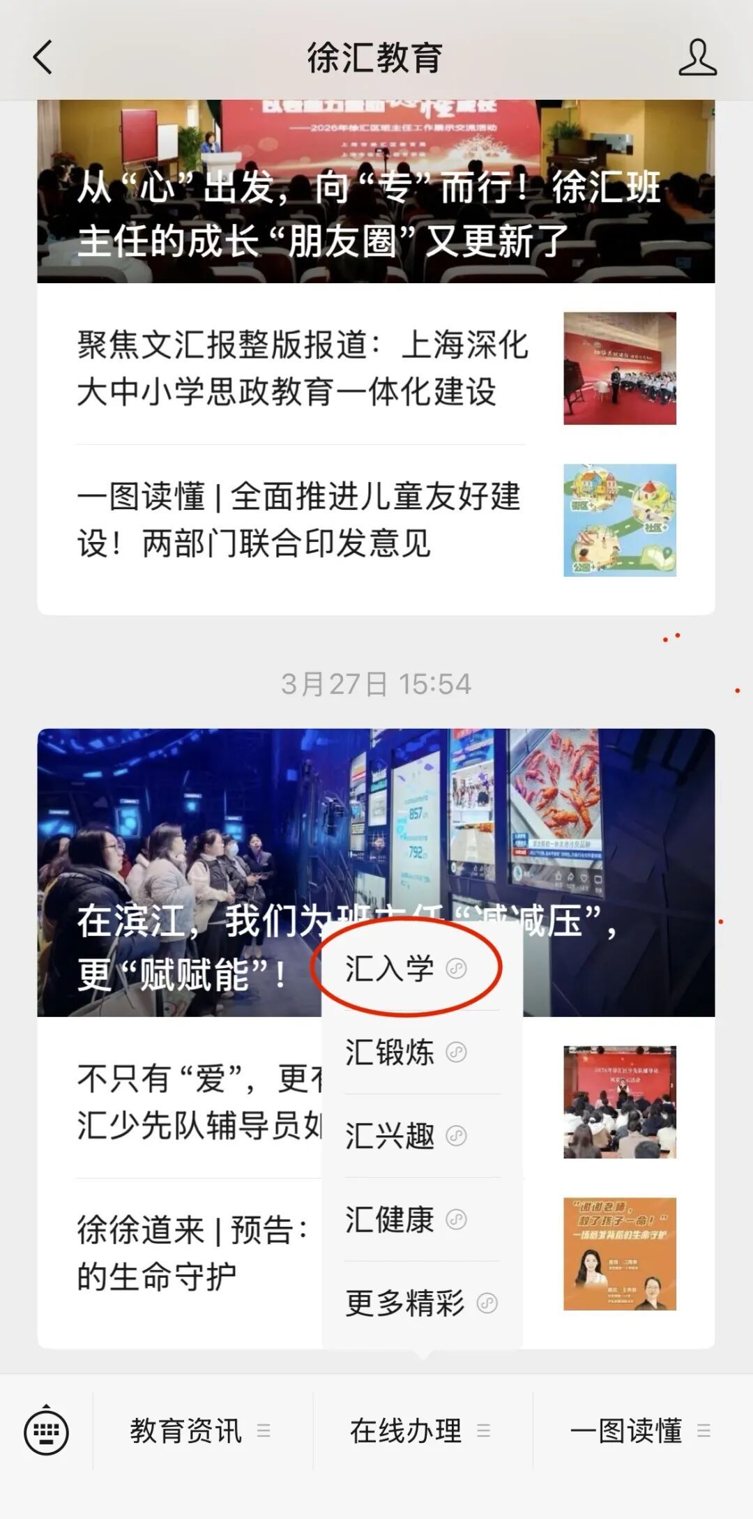 步骤1:进入“徐汇教育”微信公众号,在下方菜单栏点“在线办理”—“汇入学”。