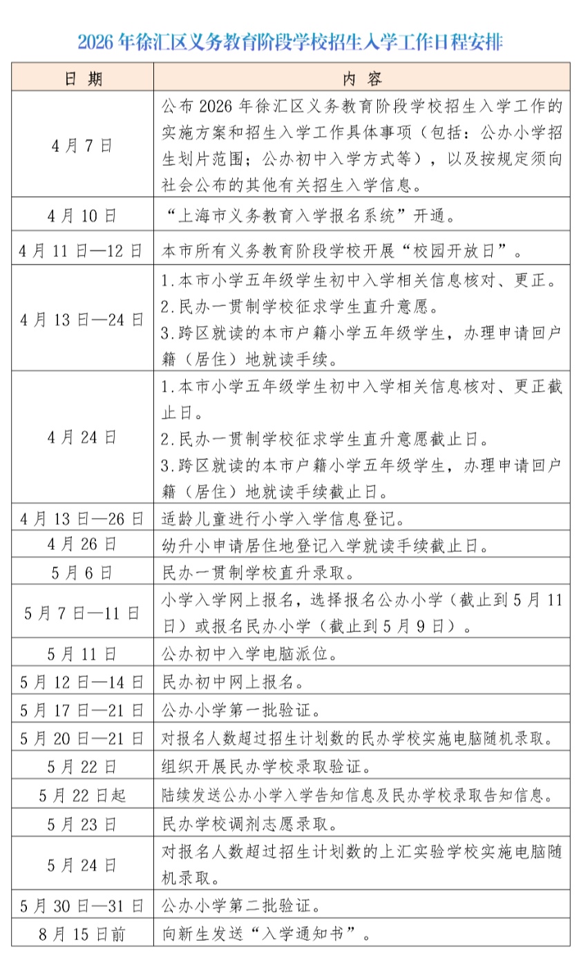 根据《中华人民共和国义务教育法》《中共上海市委 上海市人民政府关于贯彻<中共中央 国务院关于深化教育教学改革全面提高义务教育质量的意见>的实施意见》(沪委发〔2020〕3号)、《上海市教育委员会关于2026年本市义务教育阶段学校招生入学工作的实施意见》(沪教委基〔2026〕9号)精神,依法保障适龄儿童少年平等接受义务教育权利,促进依法办学、规范义务教育阶段学校招生入学工作,《徐汇区关于2026年义务教育阶段学校招生入学工作的实施方案》发布。一起来看详情