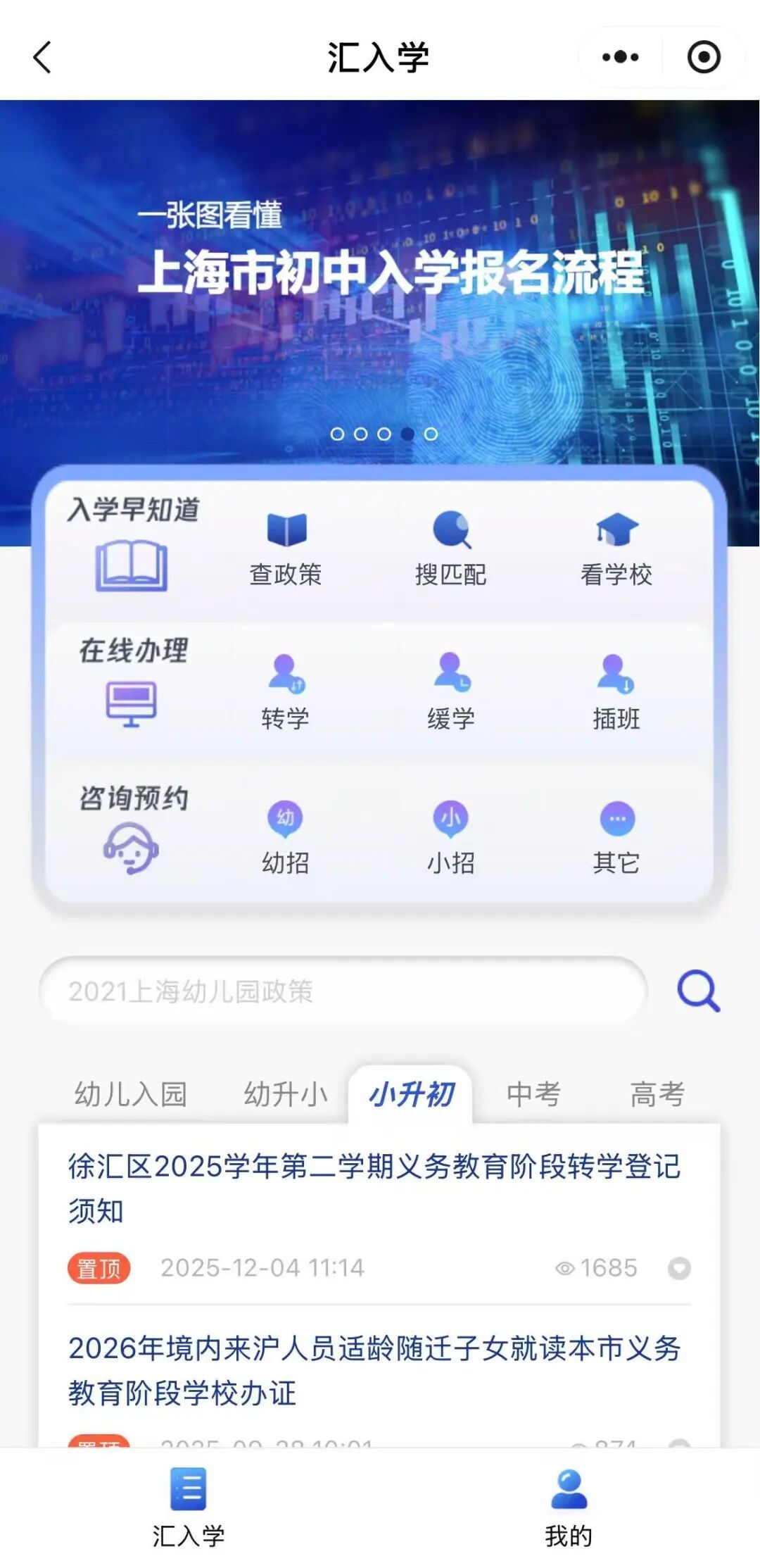 期间,您也可以通过关注“徐汇教育”微信公众号,进入“汇入学”专栏,了解详细的招生工作相关事宜。