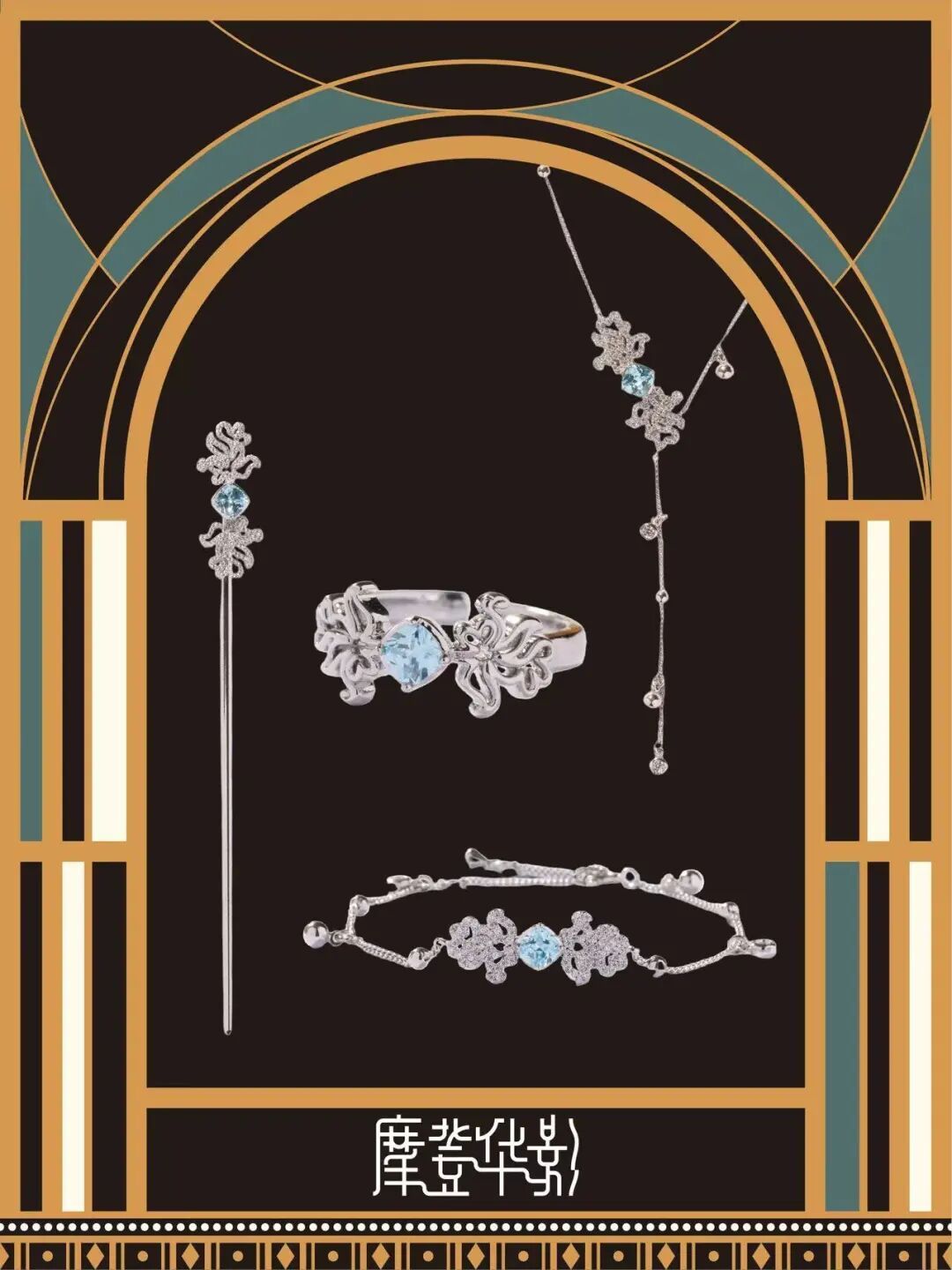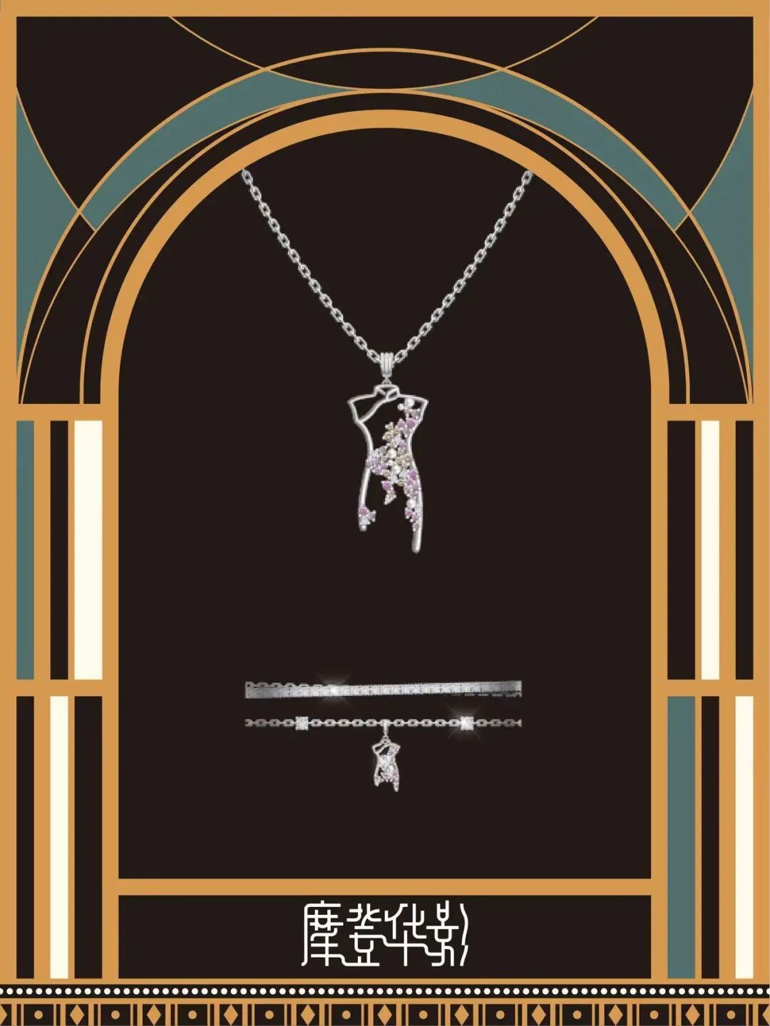 从旗袍的几何线条中汲取灵感,金色菱纹如旗袍剪裁的利落轮廓,水滴状玉饰似凝萃的月光;金的硬朗与玉的柔润相衬,将旗袍的几何美学与玉石的温婉质感融合,于颈耳间晕染出传统服饰文化与现代设计碰撞的雅致格调。