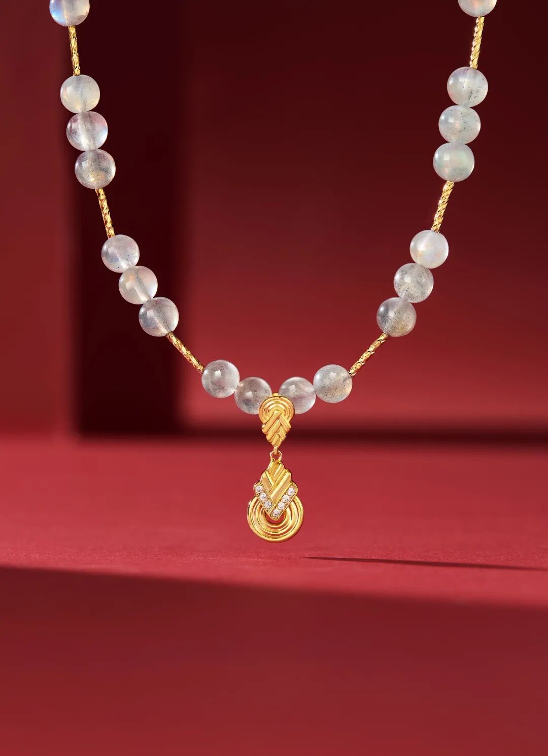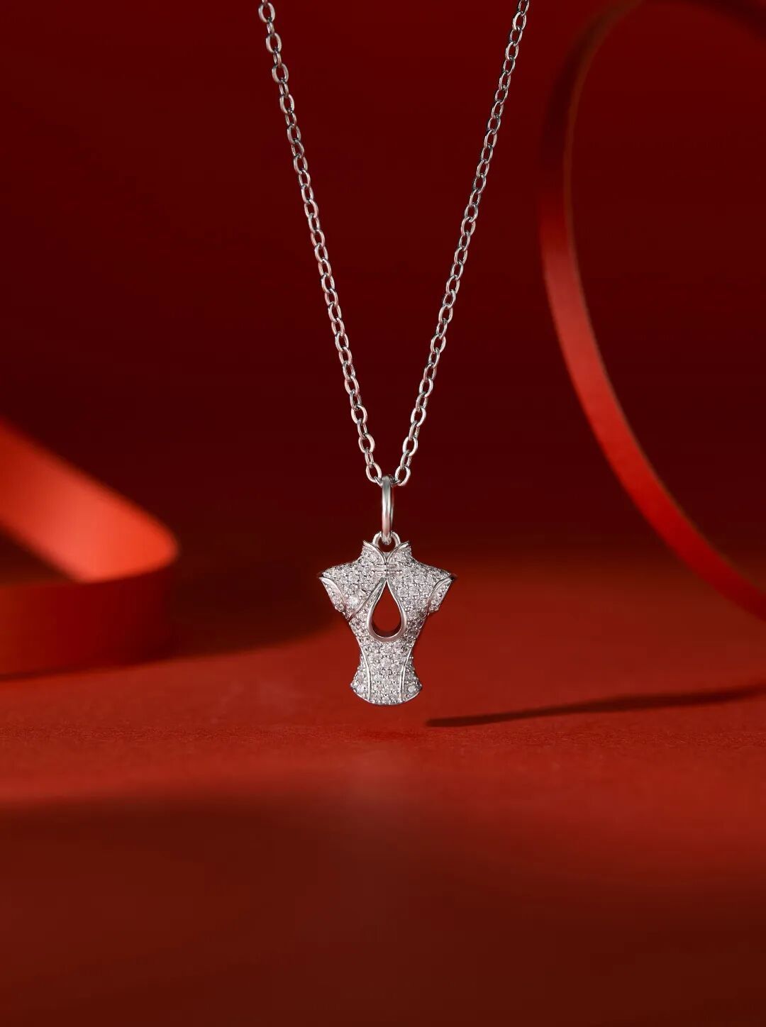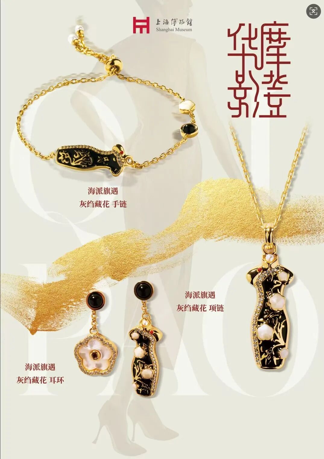 从旗袍盘扣的绾结形态中汲取灵感,金色卷草纹如盘扣般婉转灵动,似以丝线巧结东方雅韵;圆润玉珠莹润如露,承托出盘扣的古典意趣。以圆融之态传递出圆满祥和的期许,尽显东方美学的婉约与华贵。