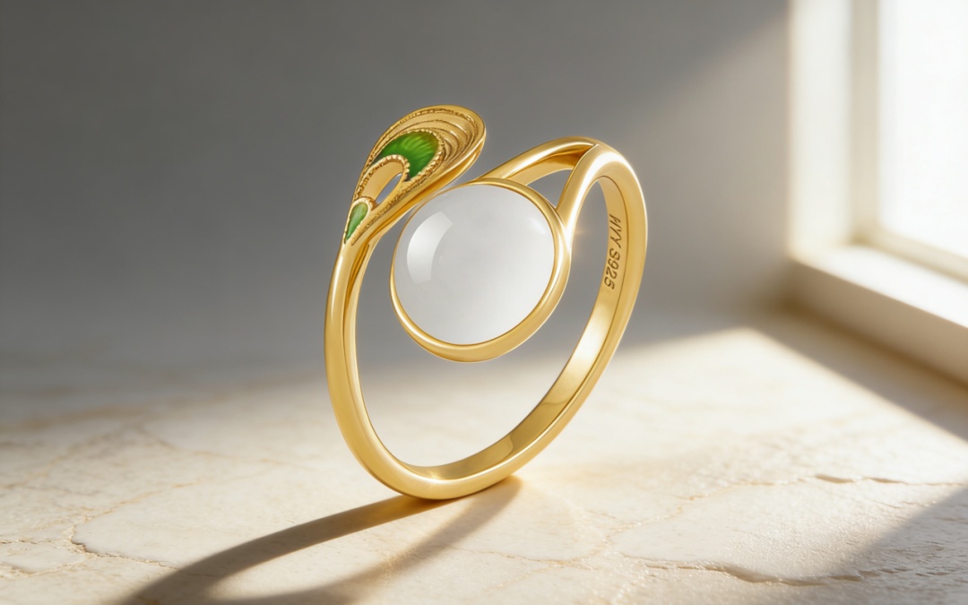 聚焦旗袍纹样中形似海螺的花卉元素,以嫩绿色渐变珐琅还原旗袍织纹的灵动层次,搭配和田玉的温润质地,将旗袍的“绮丽”、纹样的“螺趣”与玉石的“温润”融于一体,既是对传统服饰美学的当代转译,也为佩戴者承载“雅致相伴、气韵承祥”的美好寓意。
