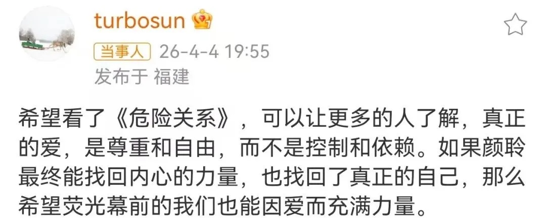 “真正的爱,是尊重和自由,而不是控制和依赖。如果颜聆最终能找回内心的力量,也找回了真正的自己,那么希望荧光幕前的我们也能因爱而充满力量。”