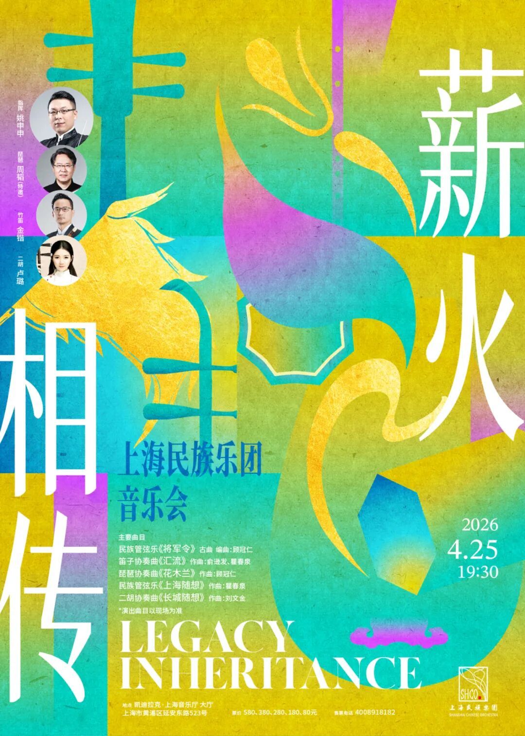 本场音乐会由上海民族乐团驻团指挥姚申申执棒,携手乐团原琵琶声部首席周韬、笛子声部首席金锴、青年演奏家卢璐,联袂演绎《花木兰》《汇流》《长城随想》《将军令》《上海随想》等创作于上世纪的经典民乐作品。
