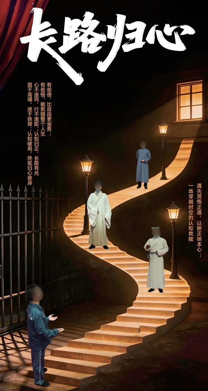 原创法治话剧《长路归心》突破传统说教式叙事,以奇幻时空穿越为艺术载体,聚焦服刑罪犯改造中的现实困惑与心理挣扎。剧情以一名罪犯在减刑名单公示后的内心抉择为切入点:一边是重获自由的热切期盼,一边是尚未履行的财产刑责任,现实困境让主角陷入迷茫与挣扎。